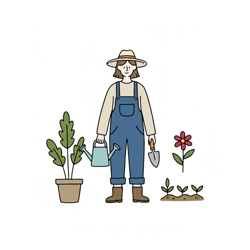 Eine Person gärtnern mit Pflanzen, Gießkanne und Schaufel.