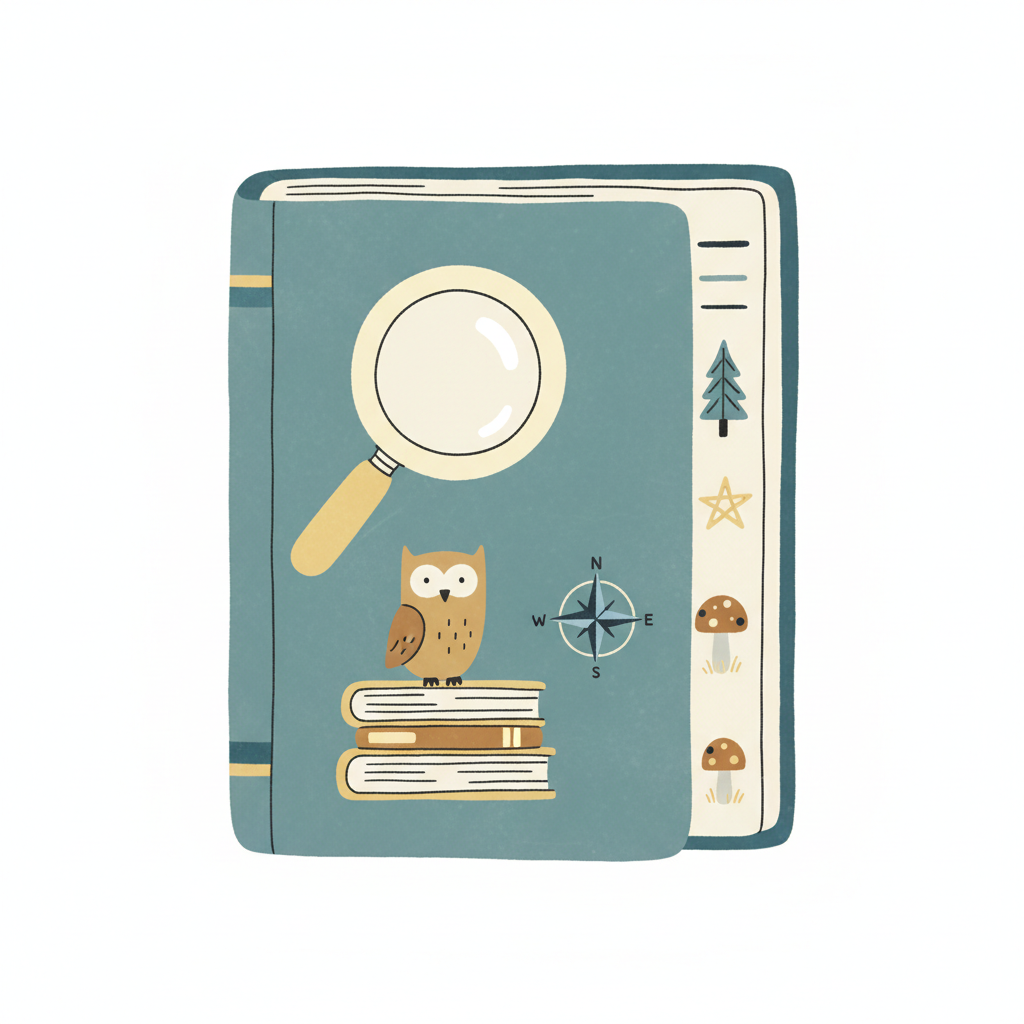 Illustriertes Buch mit Lupe, Eule auf Büchern, Kompass und Waldmotiven. Thema: Entdeckung & Wissen.