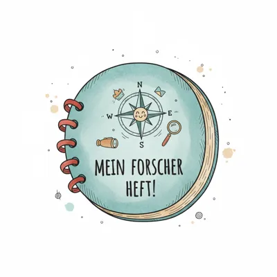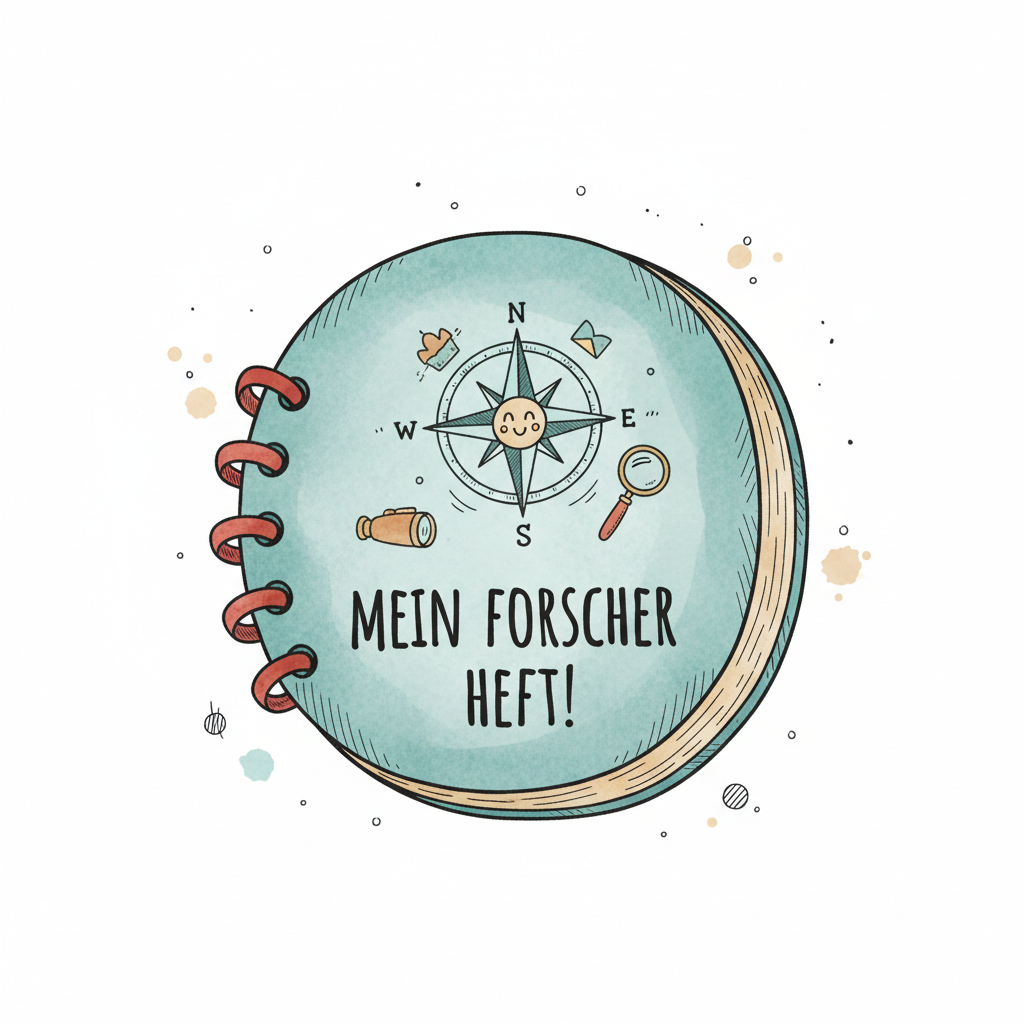 Niedliches, spiralgebundenes Notizbuch mit Kompass, Lupe, Teleskop und "Mein Forscher Heft!".