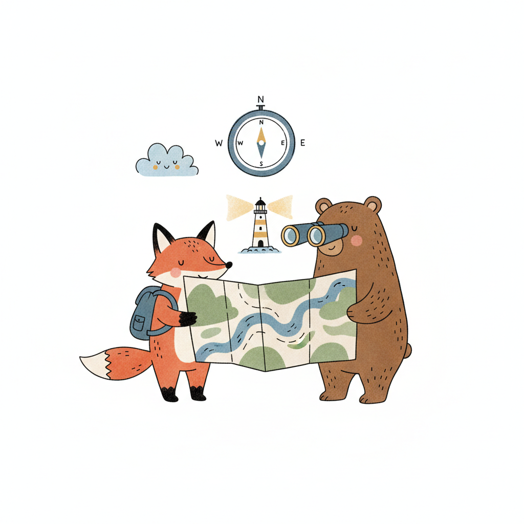 Fuchs und Bär planen ein Abenteuer mit Karte, Kompass und Fernglas.