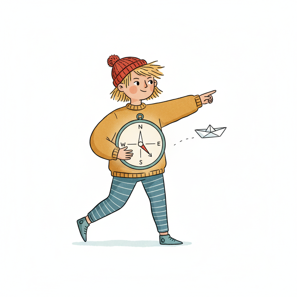 Kind mit Kompass auf der Brust zeigt einem Papierboot den Weg, symbolisiert Orientierung und Reise.