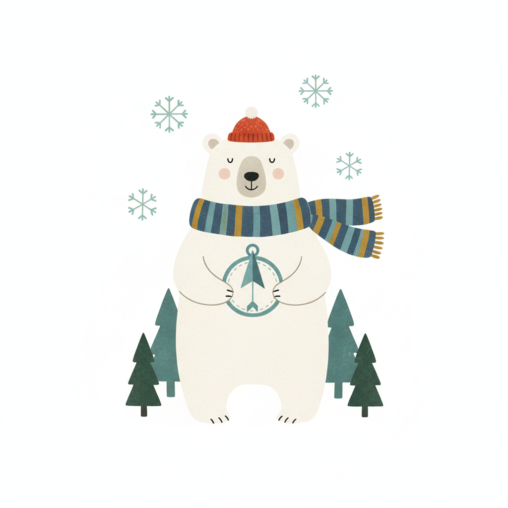 Niedlicher Eisbär mit Mütze und Schal hält einen Kompass, umgeben von Bäumen und Schneeflocken.