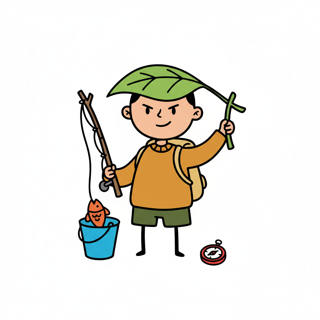 Fröhlicher Cartoon-Junge mit Blatthut, Angel und Rucksack, hat einen Fisch gefangen. Kompass dabei.