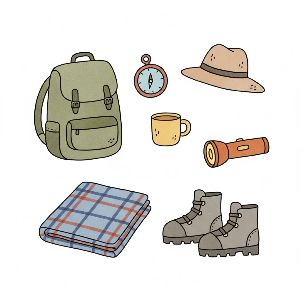 Verschiedene Outdoor-Ausrüstungsgegenstände wie Rucksack, Wanderschuhe, Kompass und Decke.