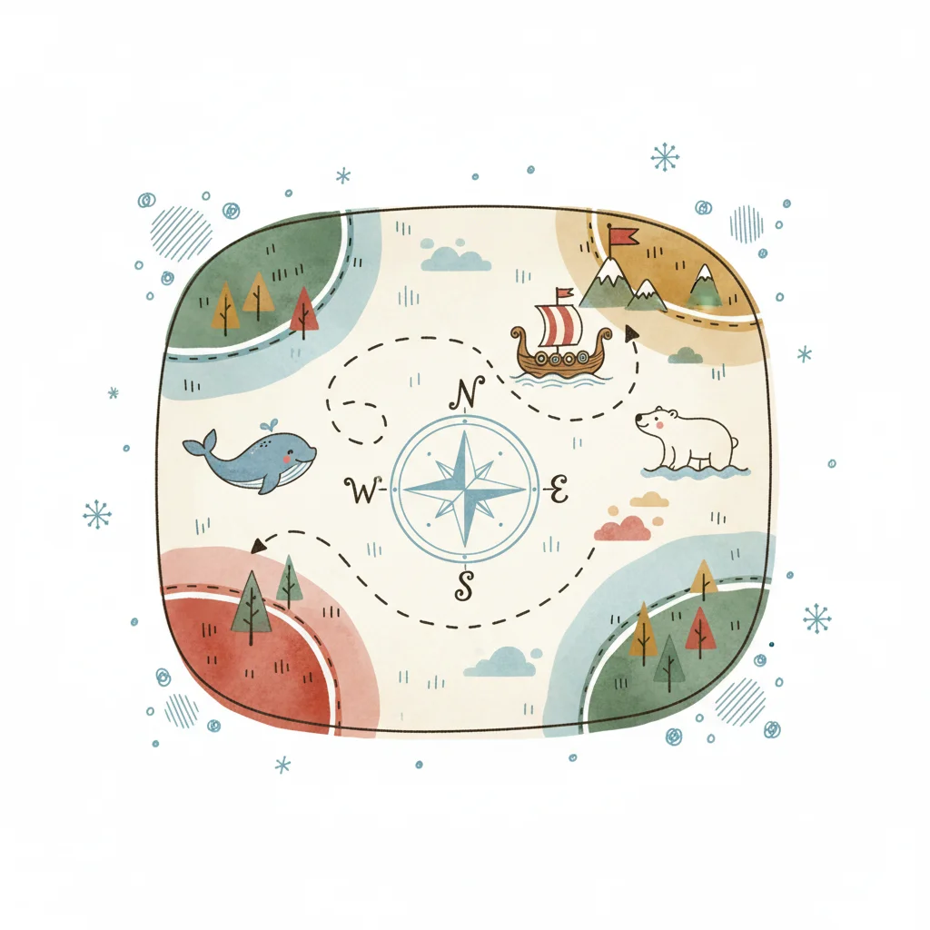 Niedliche, bunte Abenteuerkarte mit Kompass, Wal, Wikingerschiff und Eisbär in kindlichem Stil.