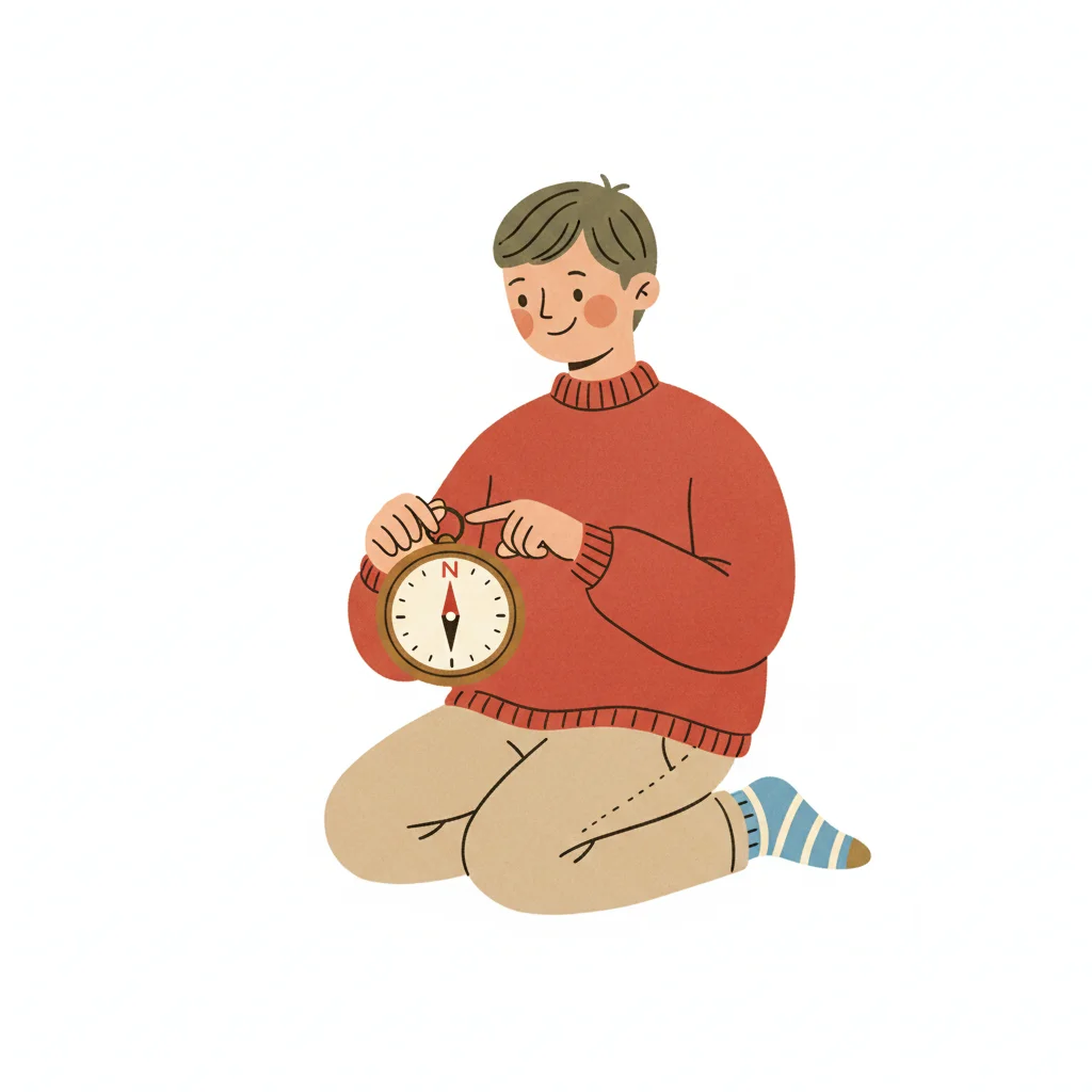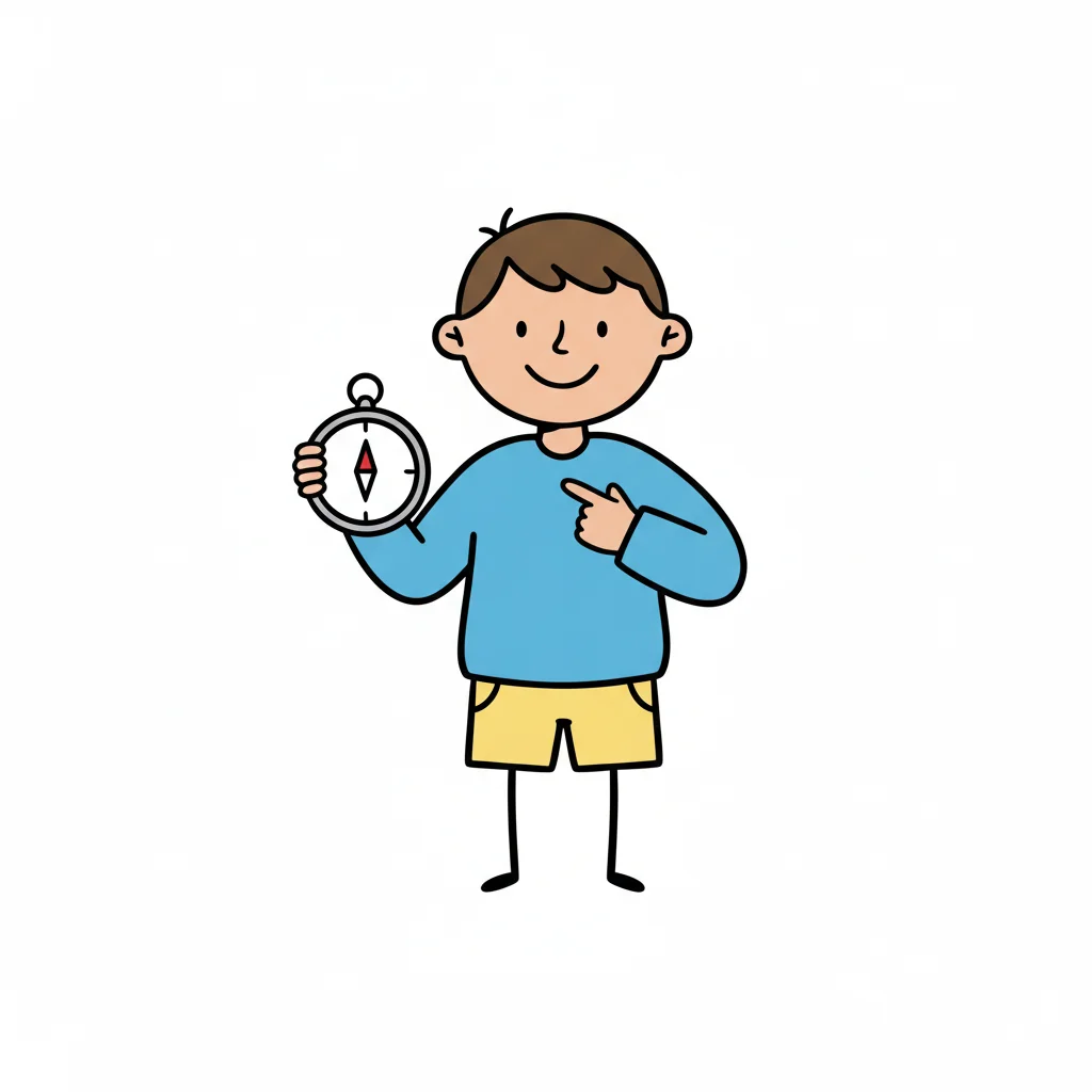 Ein lächelnder Cartoon-Junge in blauem Shirt und gelben Shorts hält einen Kompass und zeigt darauf.