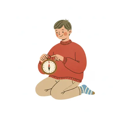 Niedlicher Cartoon-Kompass mit Gesicht und winkender Hand, umgeben von kleinen Wolken und Sternen.