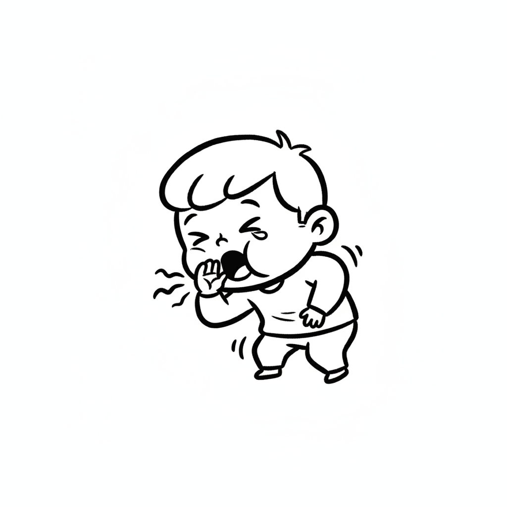 Schwarz-weiße Cartoon-Illustration eines Kindes, das hustet oder niest und die Hand vor den Mund hält.