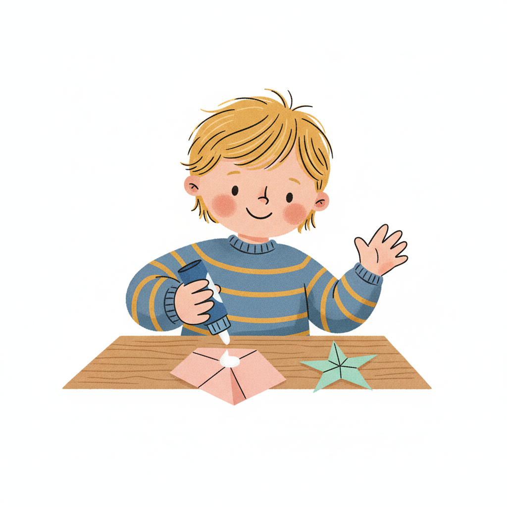 Ein Junge bastelt mit Papier und lächelt dabei.