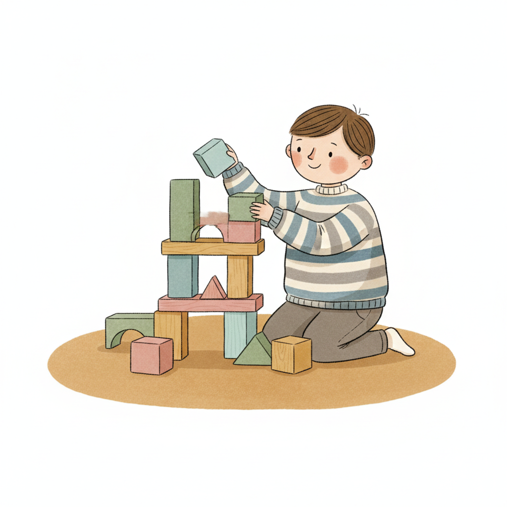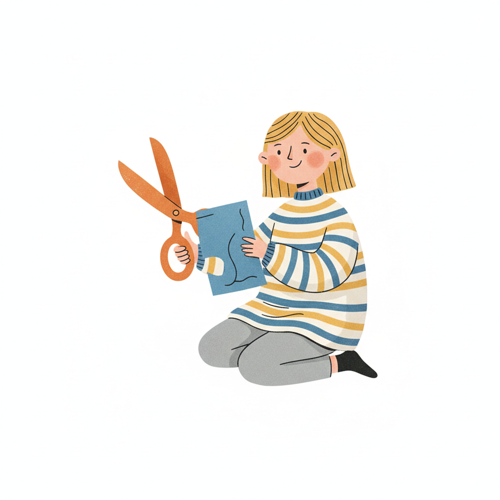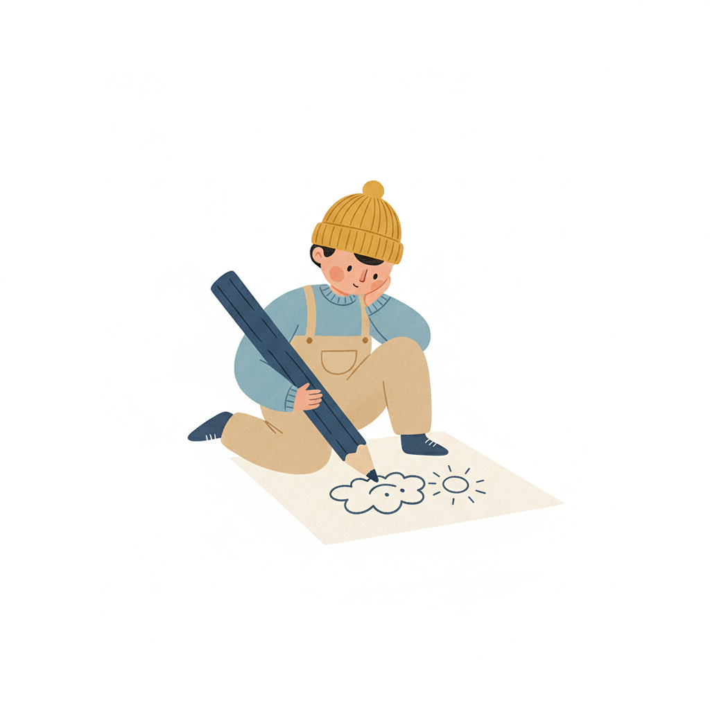 Handgezeichnete Kinderbuchillustration im modernen skandinavisch-nordischen Stil. Minimalistische, freundliche Figur mit einfachen Formen und leicht unregelmäßigen, handgezeichneten Linien. Ruhige, gedeckte Farbpalette, viel freie Fläche, reduzierte Details, sanfte Papier- oder Aquarellstruktur. Warme, ruhige, leicht humorvolle Stimmung, flächige Komposition ohne starke Perspektive, moderner nordischer Illustrationsstil, charmant und zeitlos.