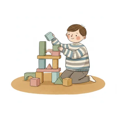 Ein Junge baut mit bunten Bauklötzen einen Turm.