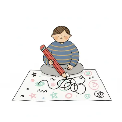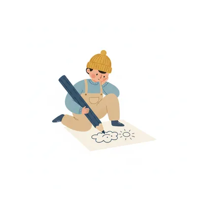 Ein Junge zeichnet mit einem großen Bleistift auf ein Blatt Papier.