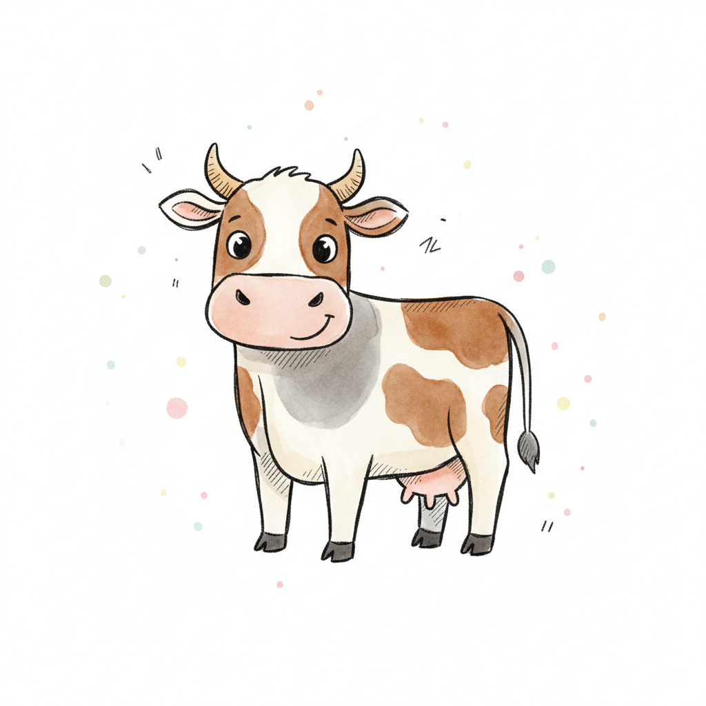 Eine niedliche, cartoonartige Kuh mit braunen Flecken und freundlichem Blick.