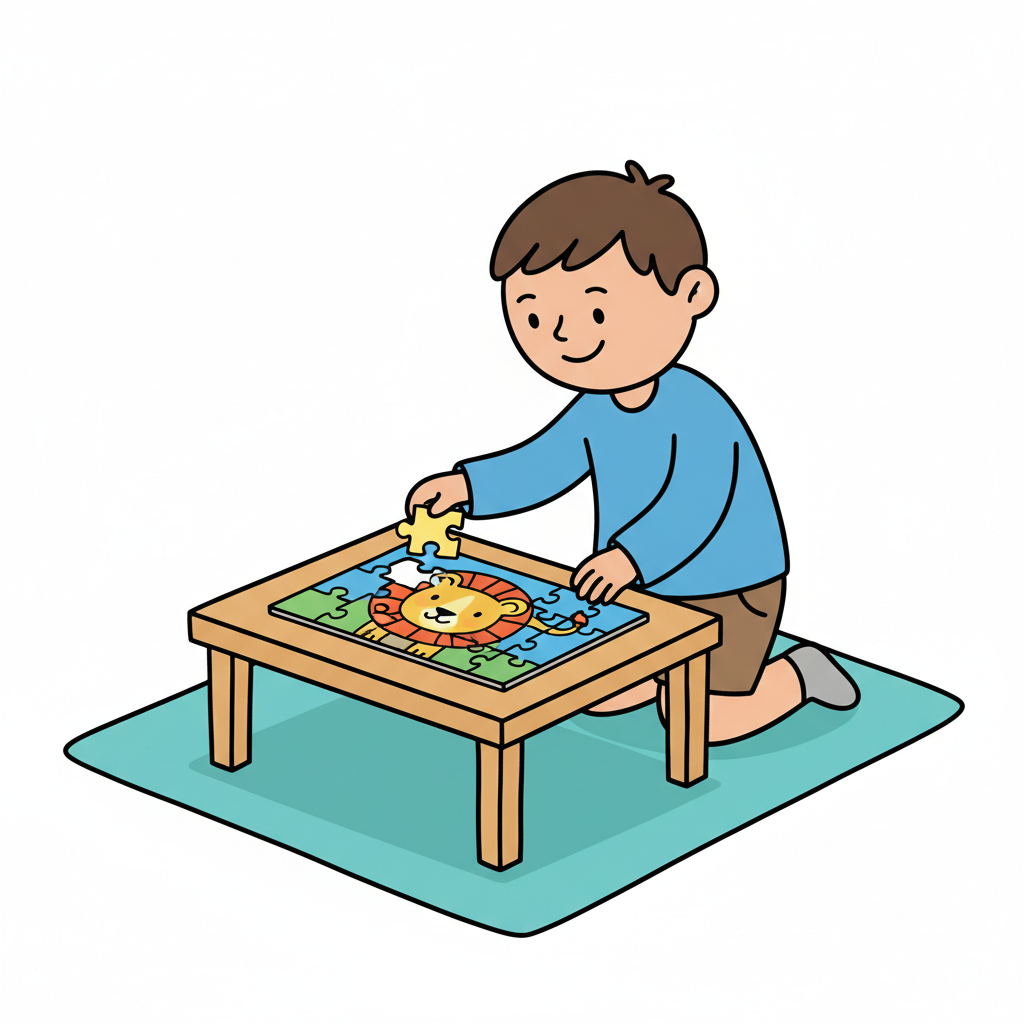 Ein Junge puzzelt ein Bild mit einem Löwen auf einem Tisch.