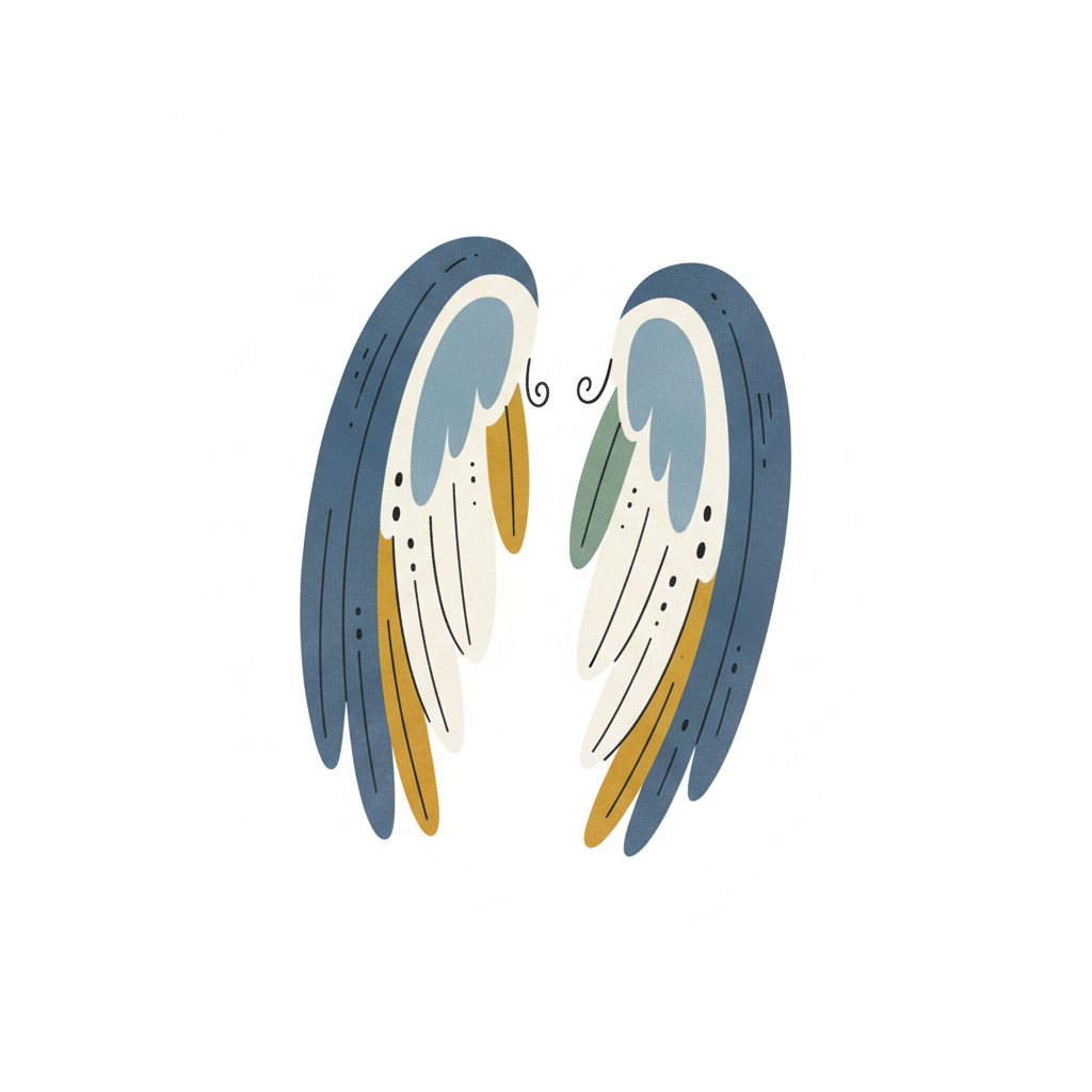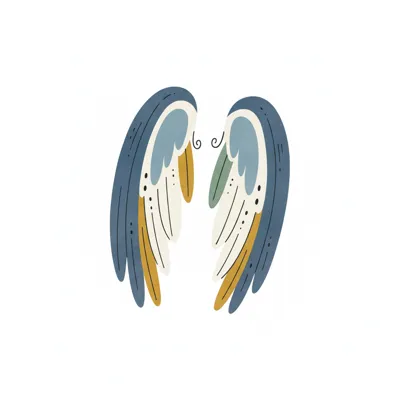 Ein Paar stilisierter, farbiger Flügel in Blau-, Gold- und Grüntönen auf weißem Hintergrund.