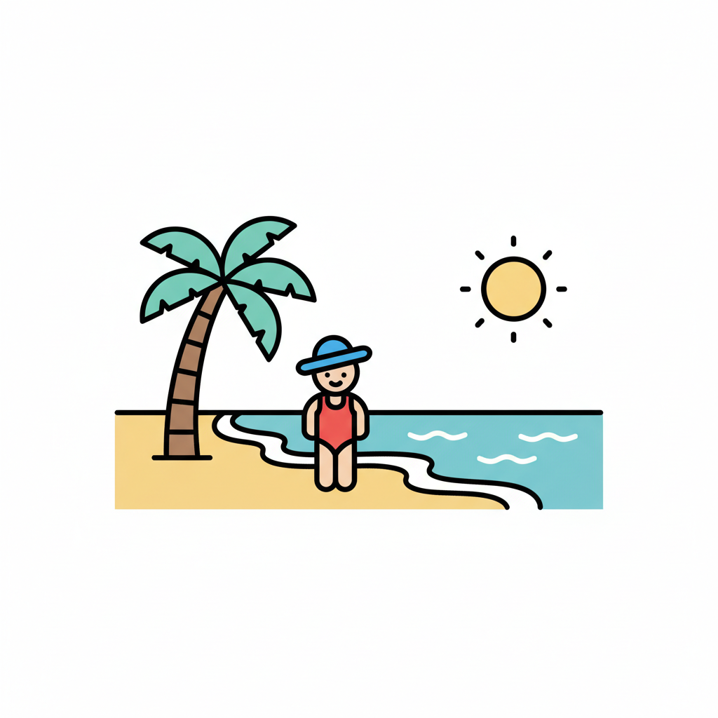 Illustration einer Person in Badekleidung am Strand mit Palme, Meer und Sonne.