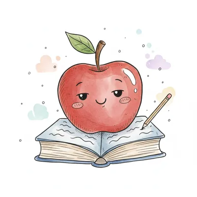 Ein lächelnder Apfel sitzt auf einem offenen Buch mit einem Bleistift daneben.