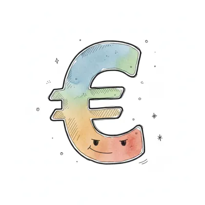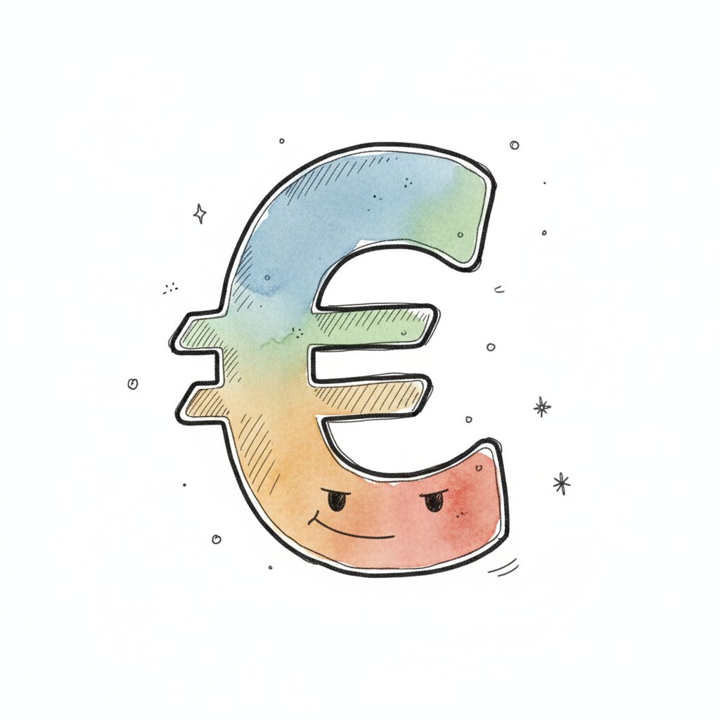 Ein farbenfrohes Euro-Symbol mit einem leicht grimmigen Gesicht, gezeichnet im Aquarell-Stil.