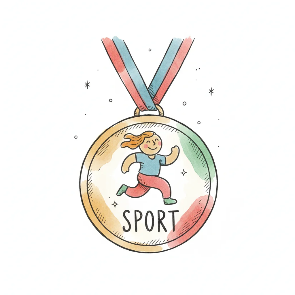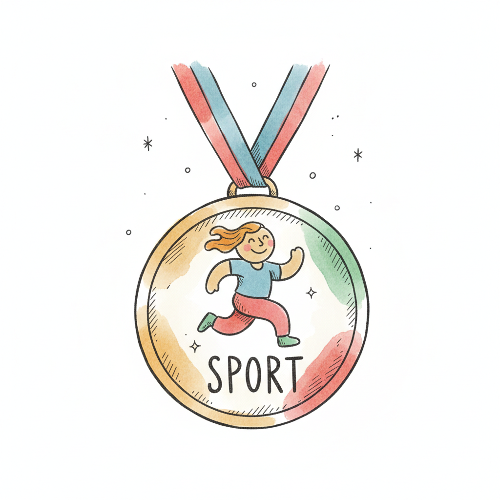 Goldmedaille mit laufender Person und 'SPORT'-Schriftzug, Aquarell-Stil.