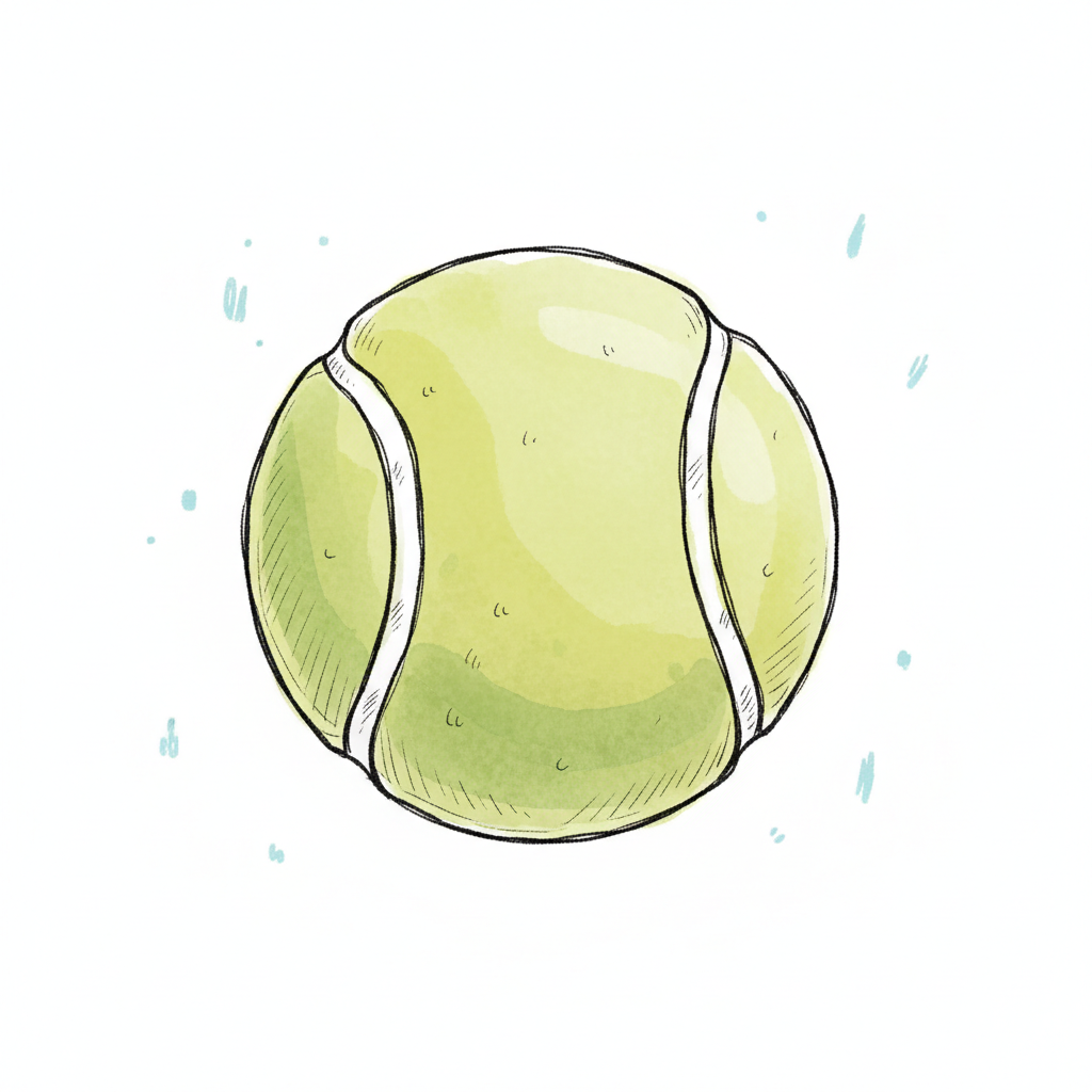 Ein handgezeichneter, gelb-grüner Tennisball mit weißen Nähten und leichten blauen Akzenten.