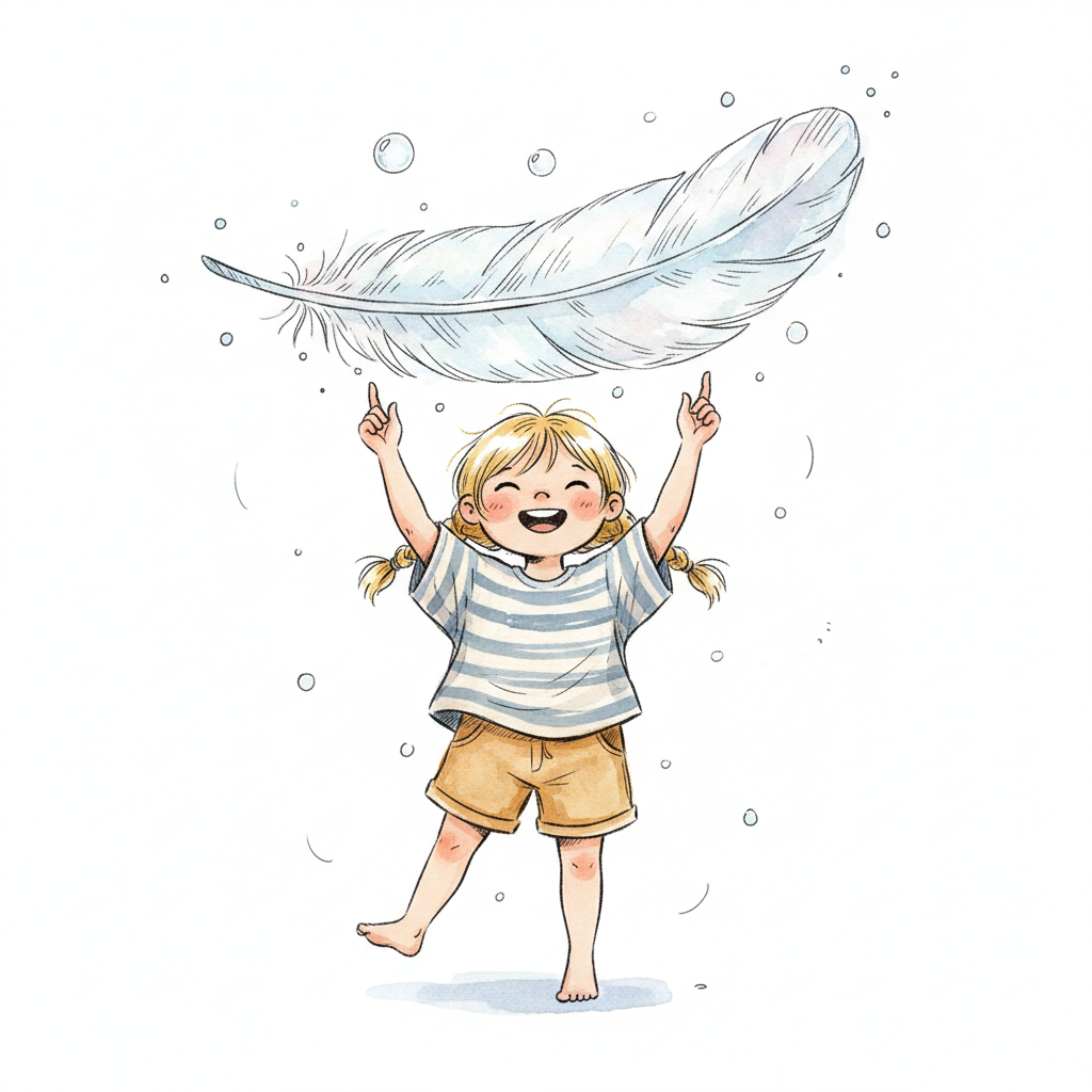 Glückliches Mädchen mit Zöpfen und gestreiftem Shirt spielt mit einer schwebenden Feder.