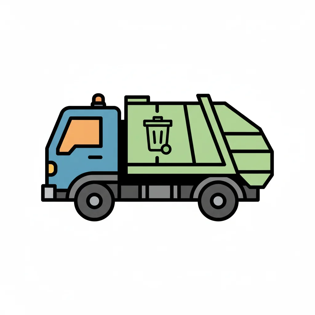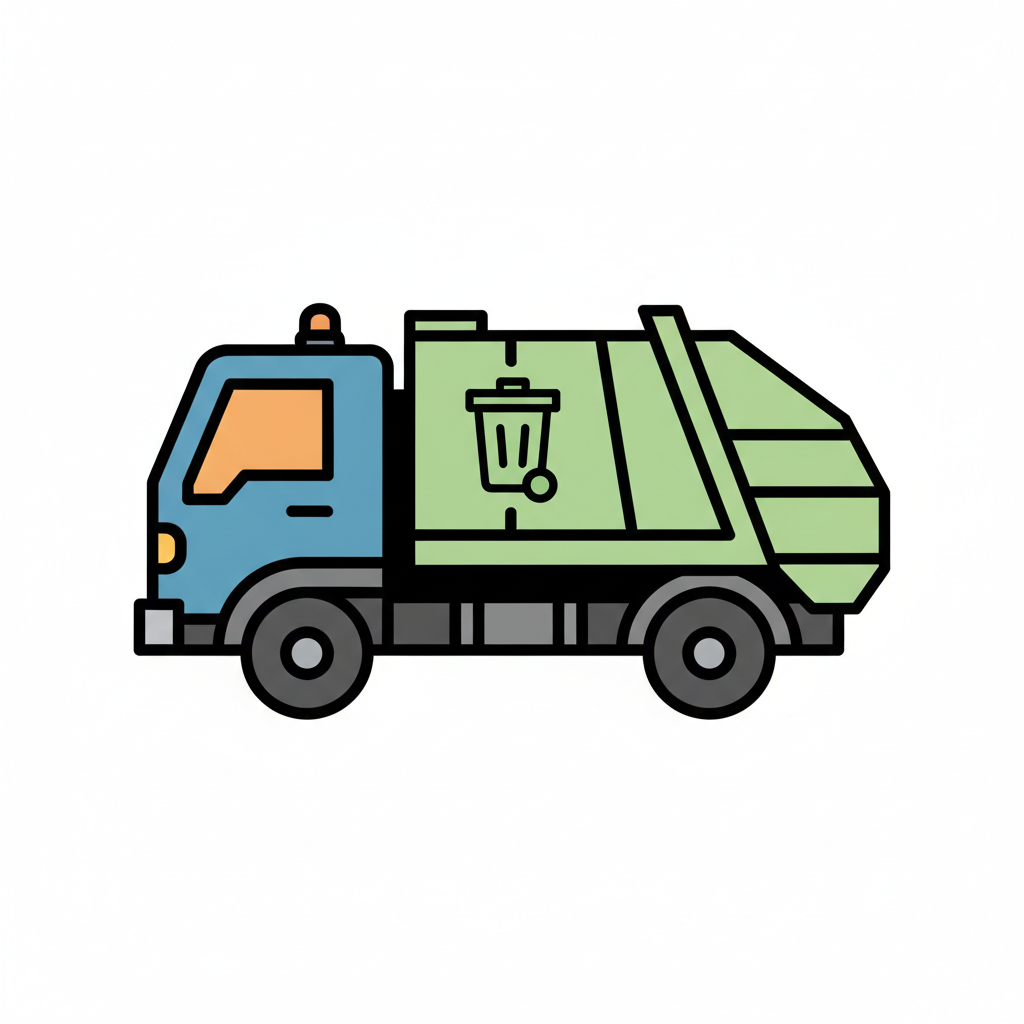 Stilisierter Müllwagen in Blau und Grün mit Mülleimer-Symbol auf weißem Hintergrund.