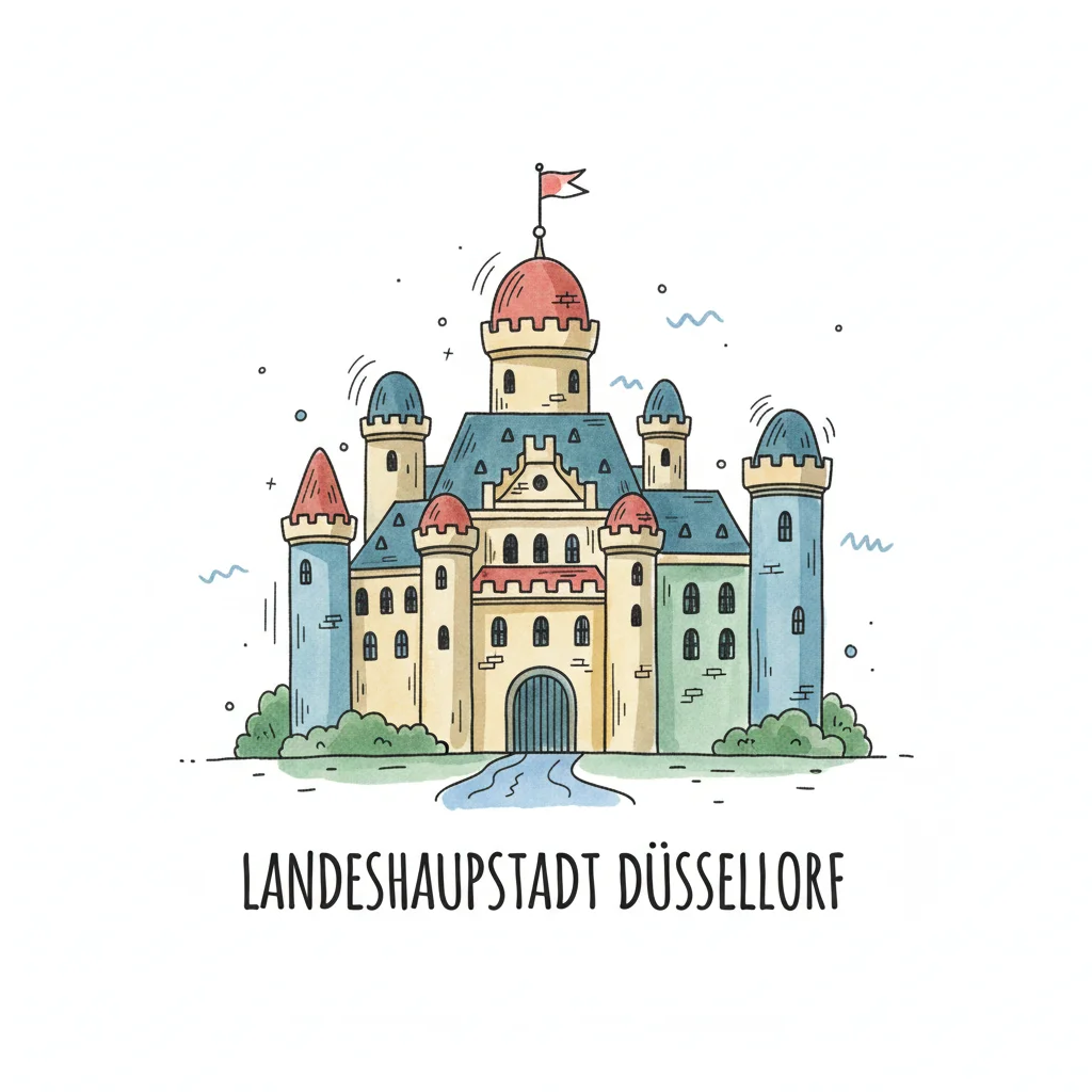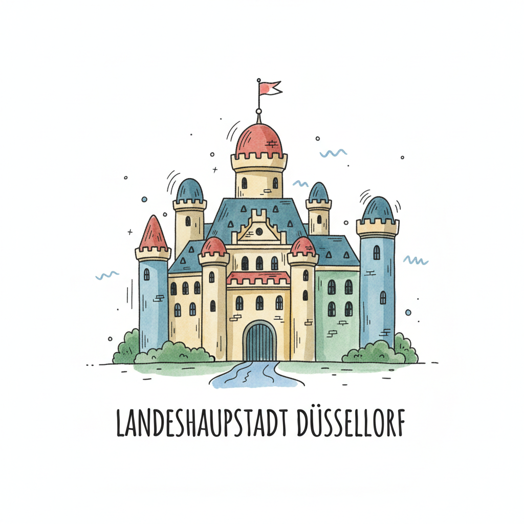 Buntes, gezeichnetes Schloss mit Türmen und Flagge, darunter der Text 'LANDESHAUPTSTADT DÜSSELDORF'.