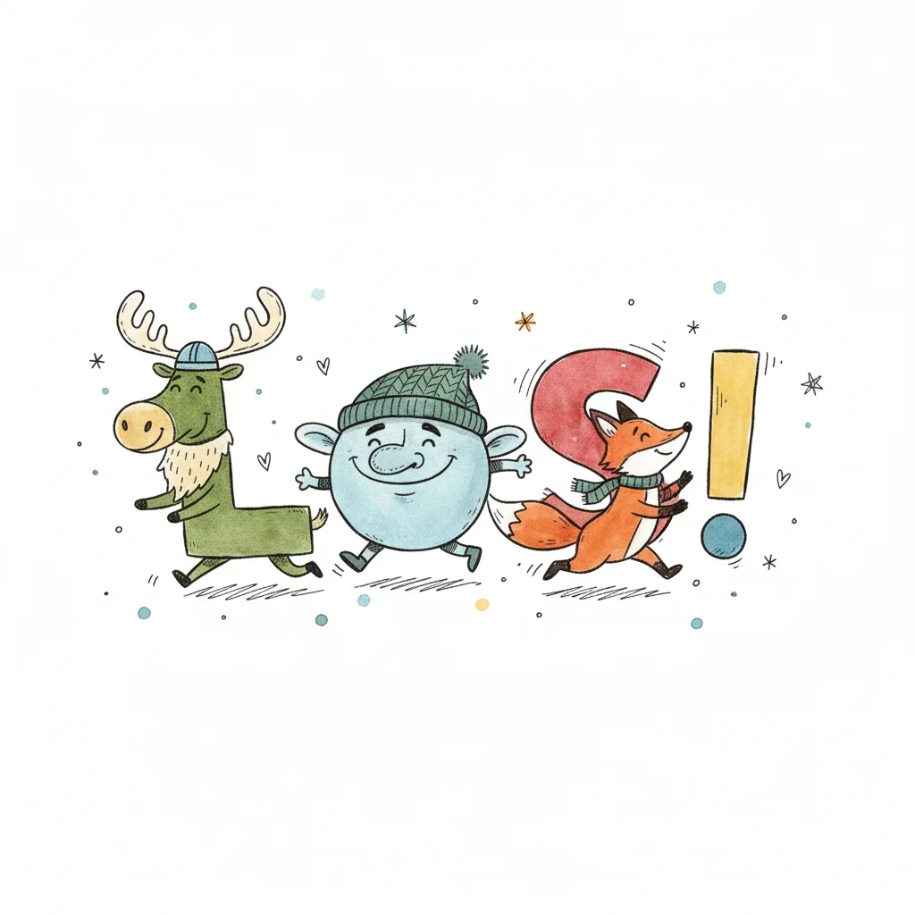 Fröhliche Cartoon-Tiere und Figur bilden "LOS!" und rennen in winterlicher Szene.
