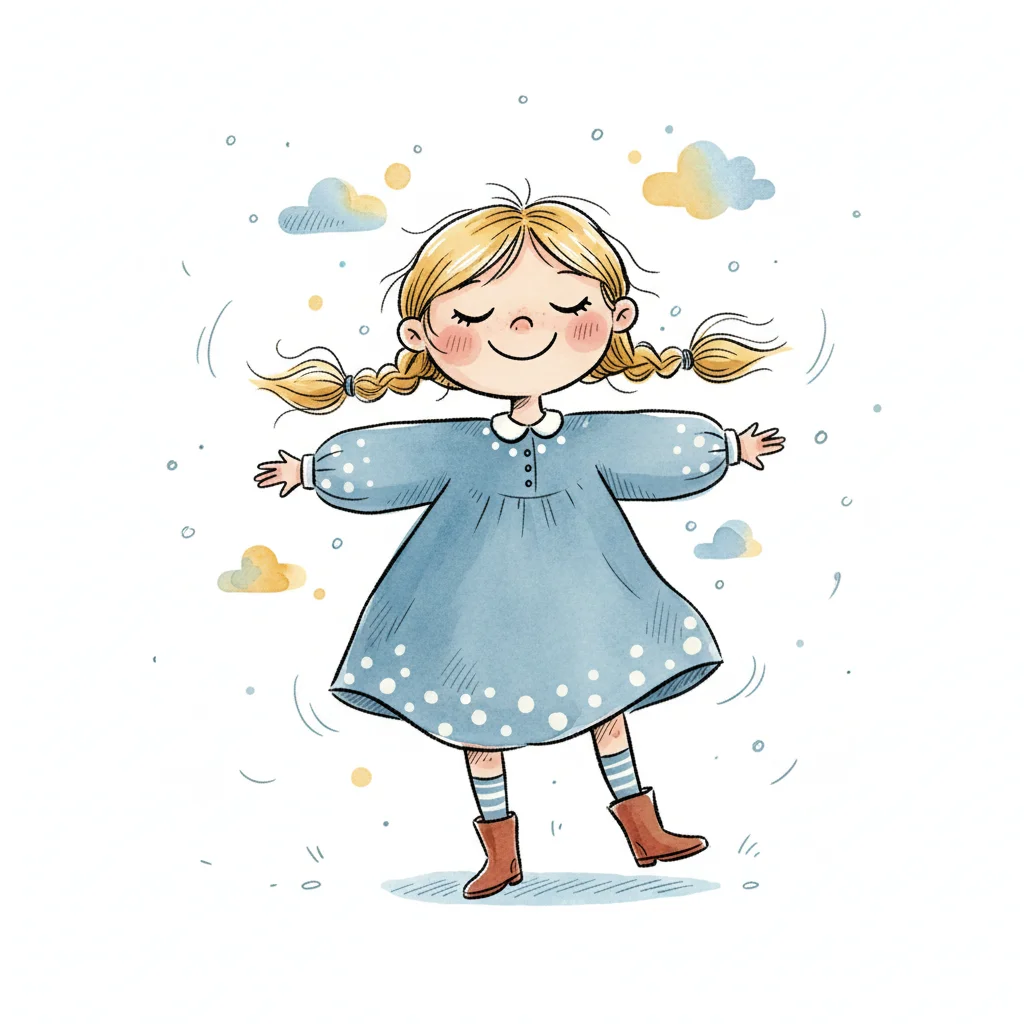 Niedliche, kindgerecht illustrierte Szene mit einem Kind oder einer Person als Hauptfigur, vor rein weißem Hintergrund, im frech-nordischen Aquarell-Skizzenstil. Klare, leicht wackelige Tuschekonturen, sichtbare Pinsel- und Strichtextur, dezente Schraffuren, weiche handgemalte Farbflächen in gedeckten Farben. Einfache, runde Formen. Keine harten Schatten, sondern sanfte, transparente Aquarellschichten. Leicht raue, handgezeichnete Linien statt glatter Vektorkanten. Subtile, vereinzelte Kritzelpunkte oder kleine Details im Hintergrund (wie Pünktchen oder feine Striche), aber keine echte Umgebung oder Landschaft. Die Figur ist mittig zentriert. Insgesamt charmant, humorvoll, warm und handgemacht wirkend. WICHTIG: Das Bild darf ABSOLUT KEINEN TEXT, KEINE BUCHSTABEN und KEINE ZAHLEN enthalten.