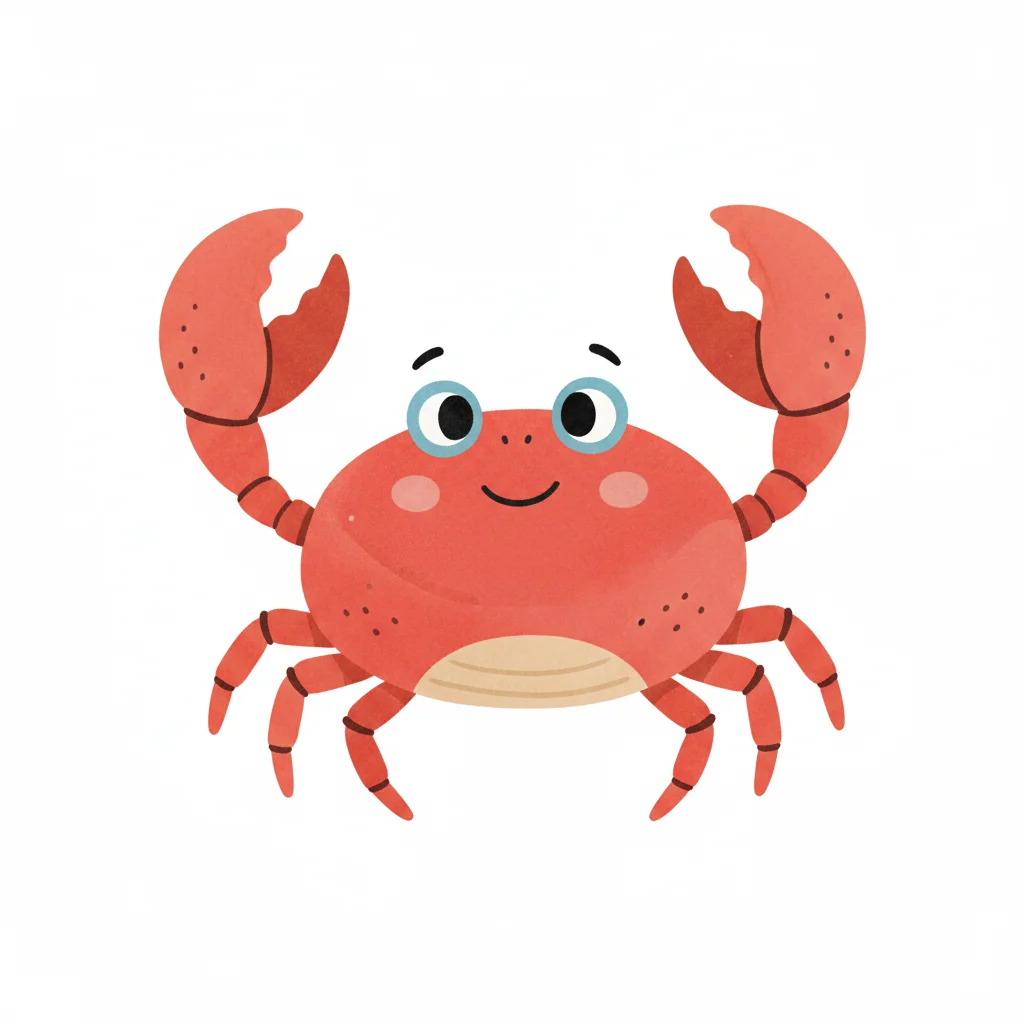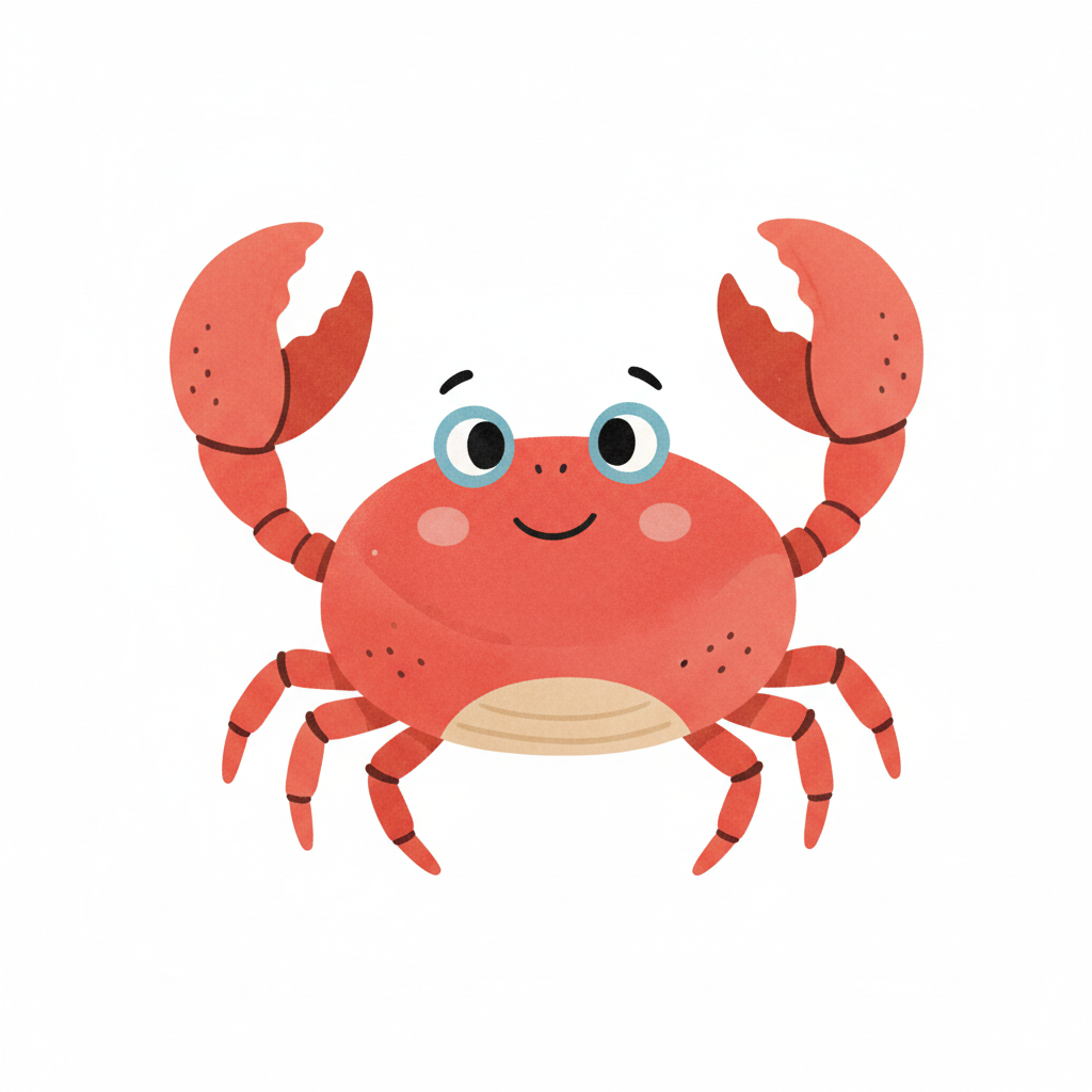 Ein lustiger, cartoonartiger Krebs mit großen Augen und freundlichem Gesicht.