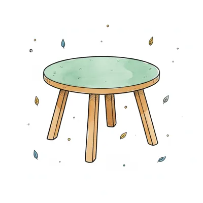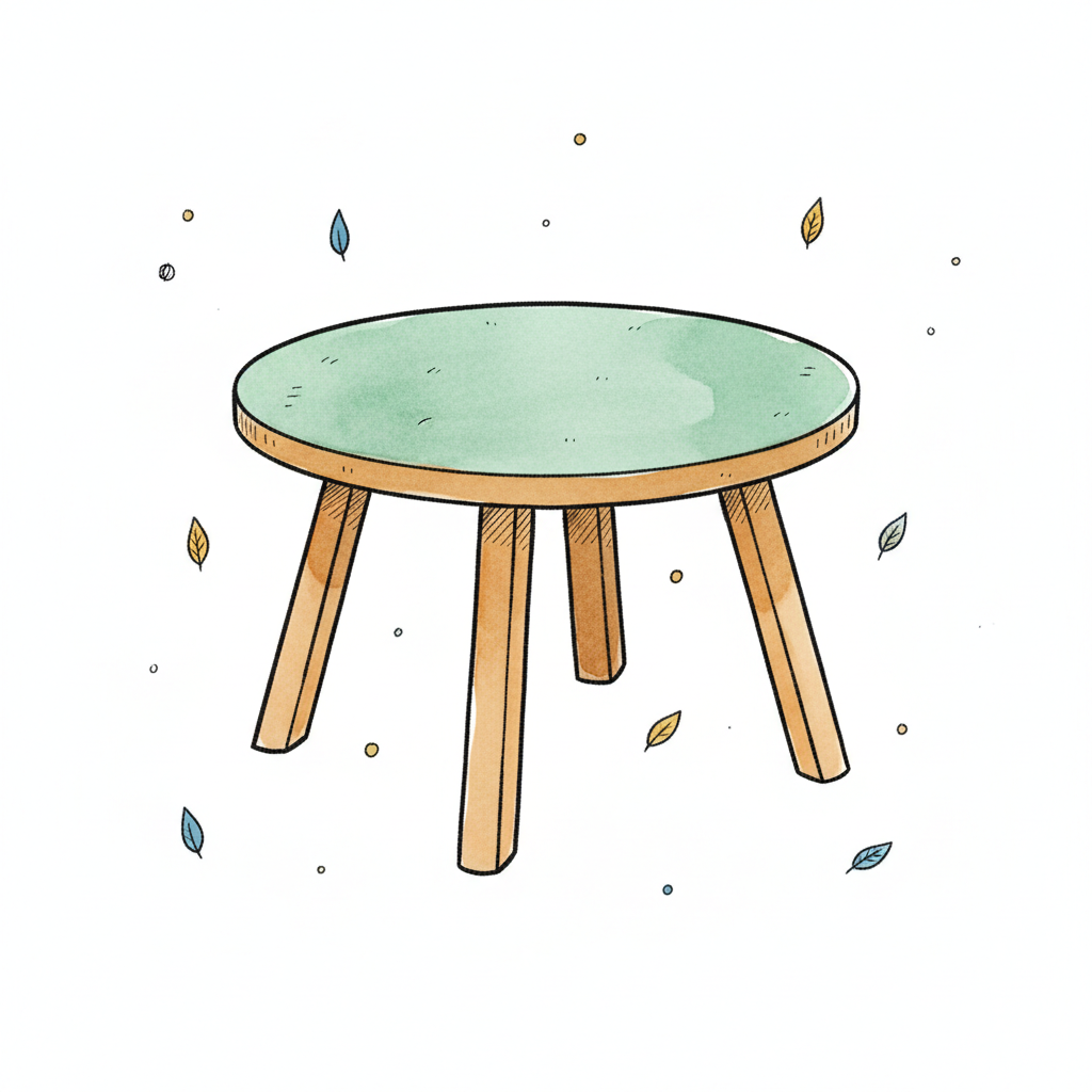 Runder Tisch mit grünem Tischblatt und Holzbeinen, umgeben von Blättern.
