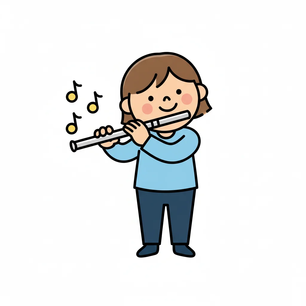 Ein Kind spielt fröhlich Flöte mit Noten schweben um es.
