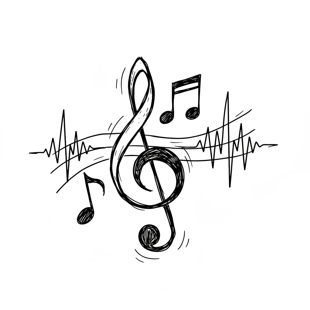 Musiknoten und Klangwellen in skizzenhafter Darstellung.