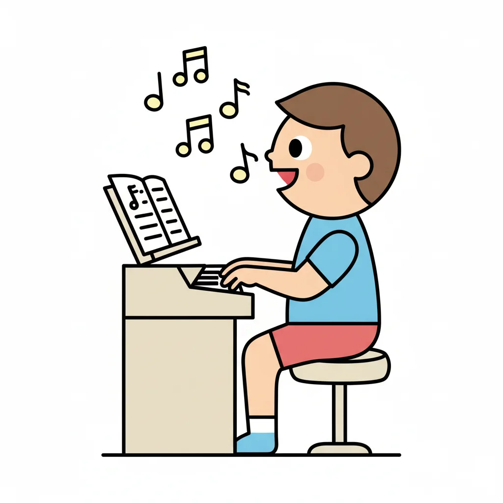 Ein Junge spielt fröhlich Klavier und singt mit Noten über ihm.