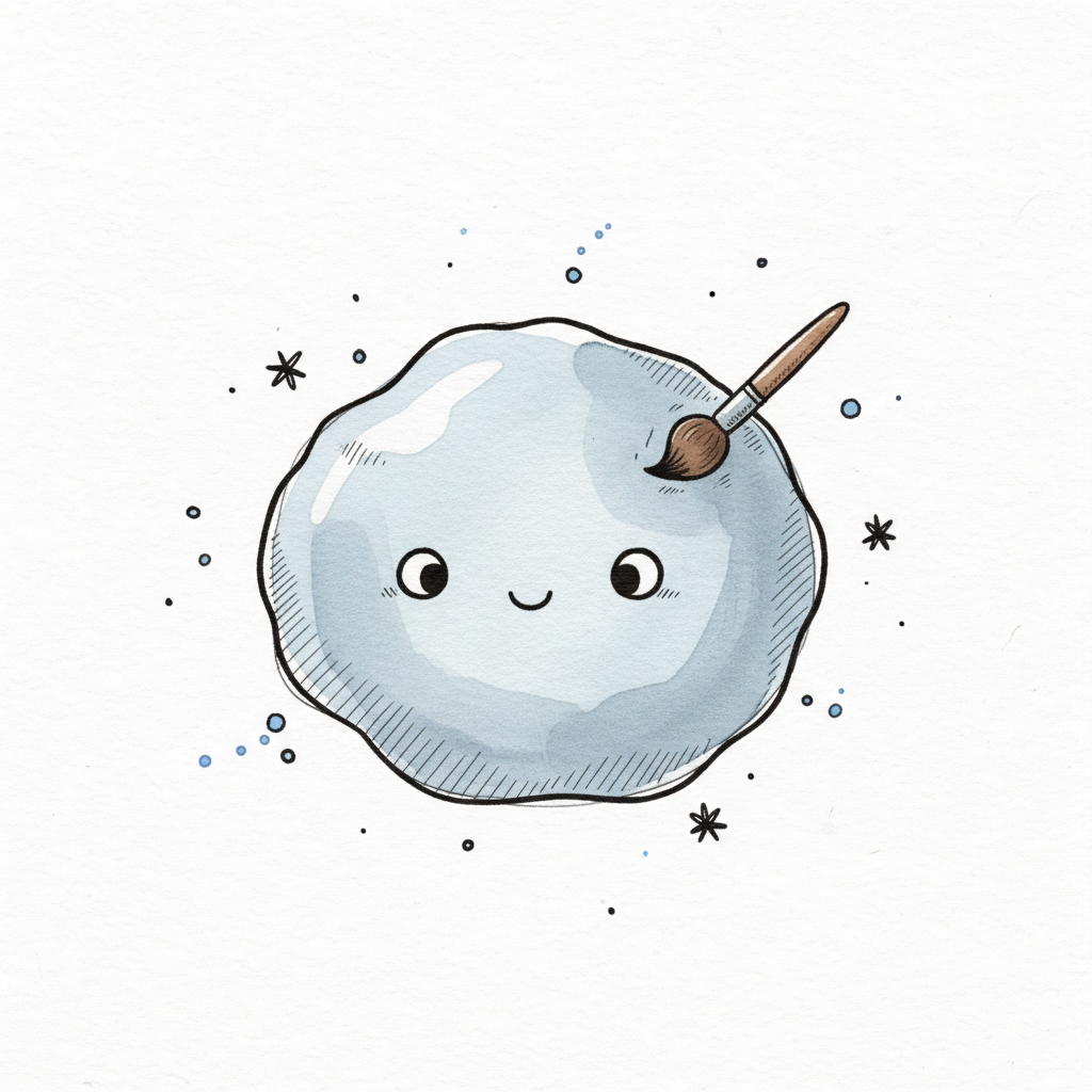 Niedliche blaue Wolke mit Pinsel und lächelndem Gesicht, umgeben von Sternen und Punkten.