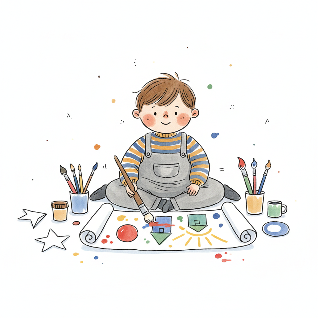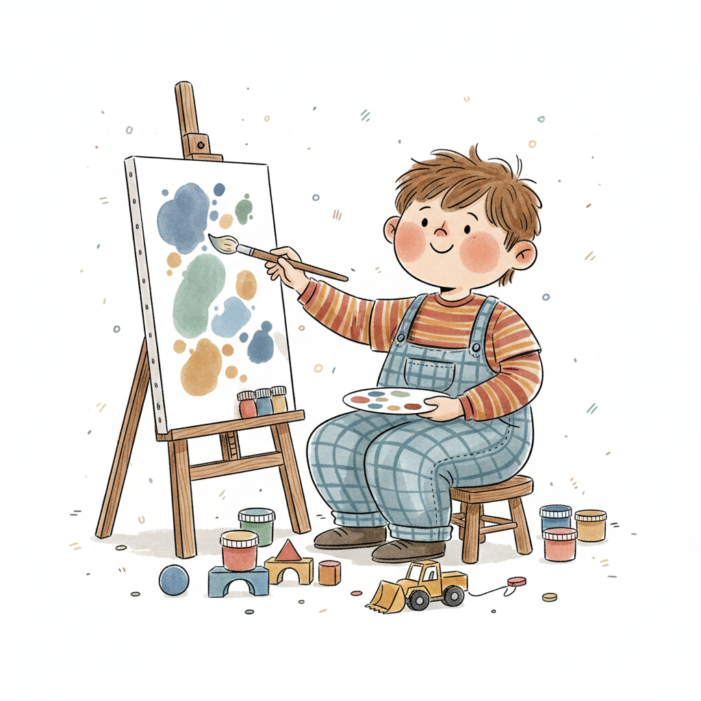 Ein kleiner Junge malt mit Pinsel und Palette auf einer Staffelei, umgeben von Spielzeug.