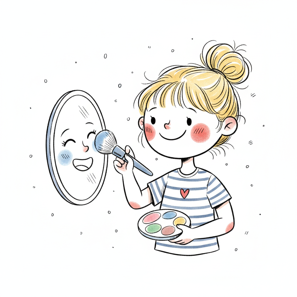 Fröhliches Mädchen schminkt lächelndes Spiegelbild mit Pinsel und Palette.