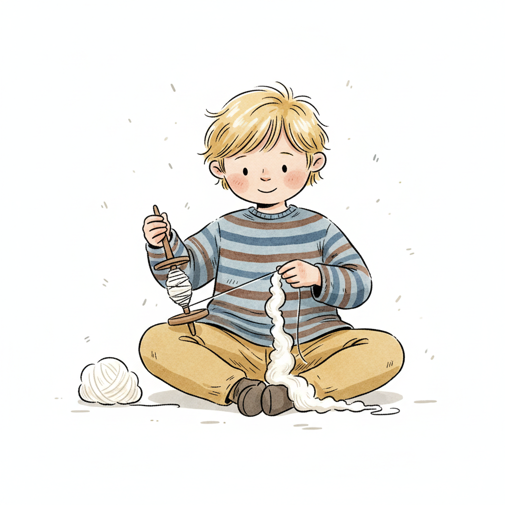 Ein blonder Cartoon-Junge sitzt und spinnt Wolle mit einer Handspindel.