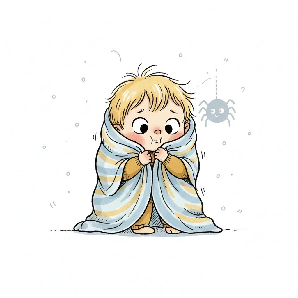 Ängstliches Kind in Decke gehüllt, blickt auf eine kleine, lächelnde Spinne.