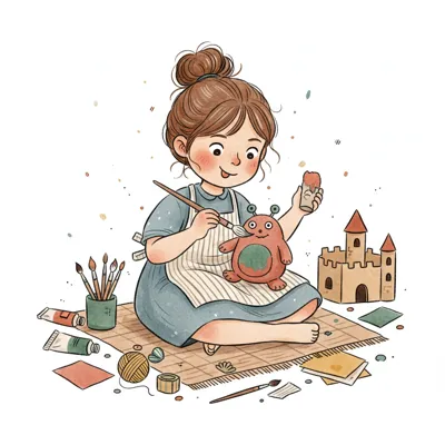 Fröhliches Mädchen bemalt eine Figur mit Pinsel und Farben, umgeben von Bastelmaterial.