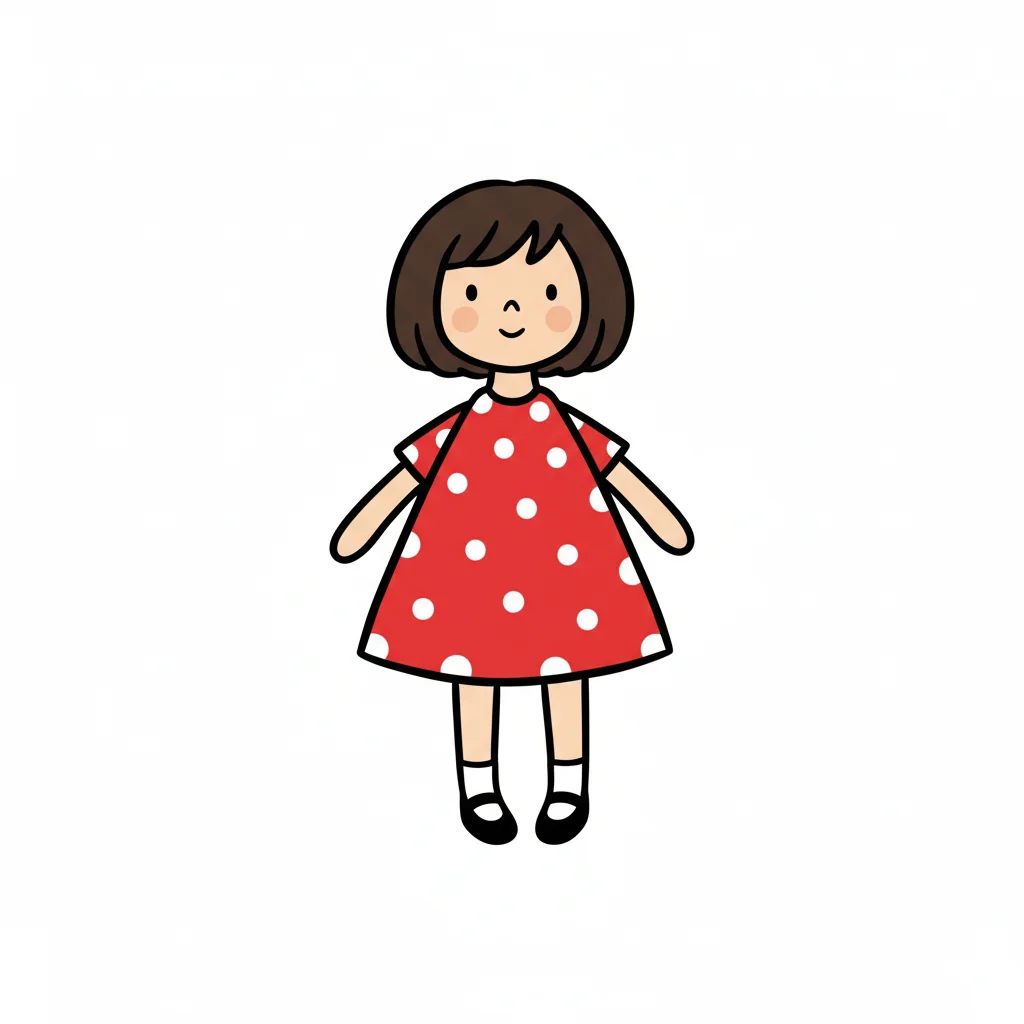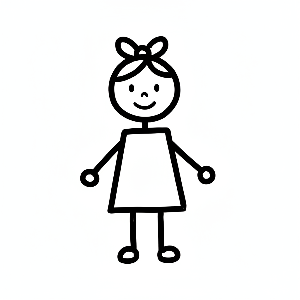 Ein gezeichnetes Mädchen mit einer Schleife und einem quadratischen Kleid.
