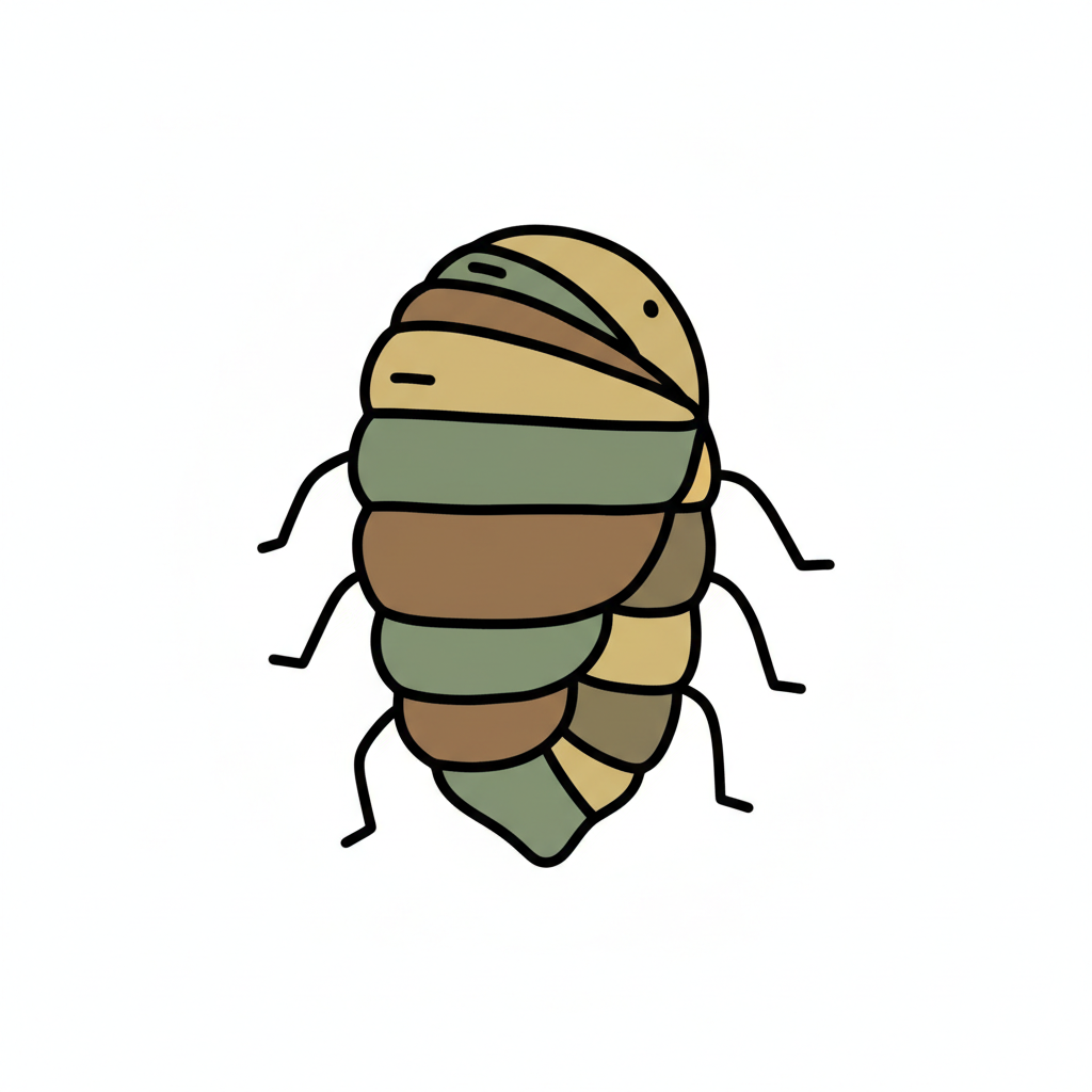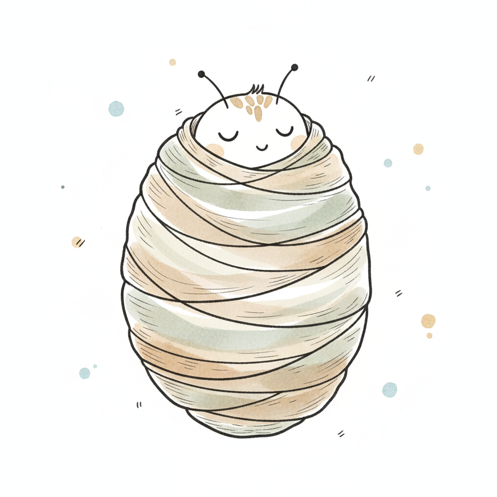 Eine cartoonhafte Raupe, eingewickelt in weichen, hellen Stoffen.