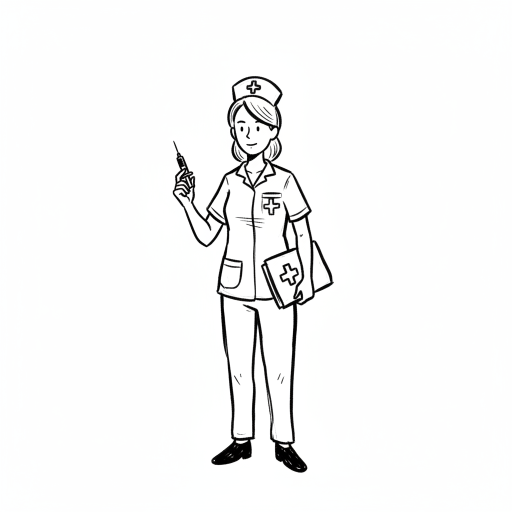 Schwarz-weiße Zeichnung einer lächelnden Krankenschwester mit Spritze und Aktenordner.