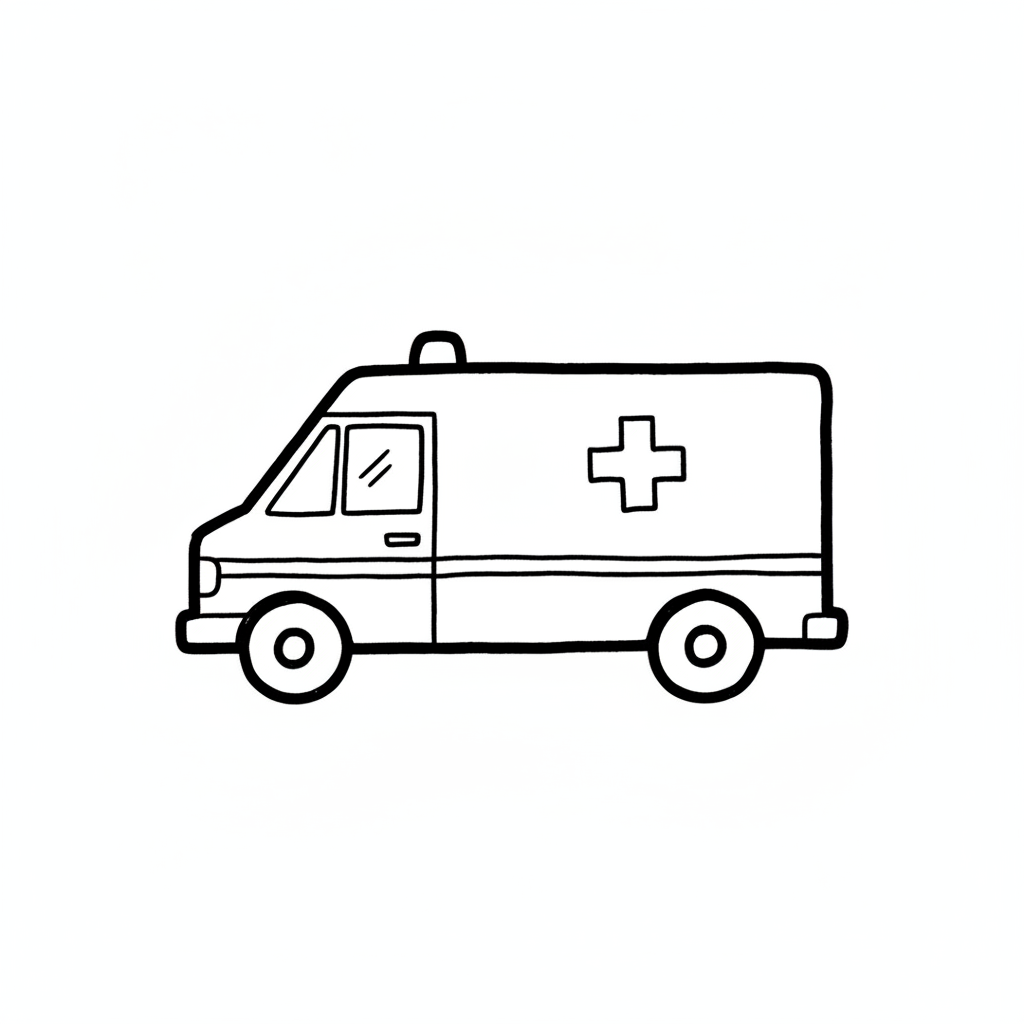 Einfache Schwarz-Weiß-Zeichnung eines Krankenwagens mit einem Kreuzsymbol.