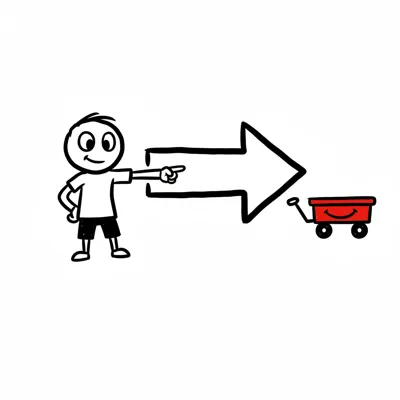 Strichmännchen zeigt mit Pfeil auf lächelnden roten Wagen.