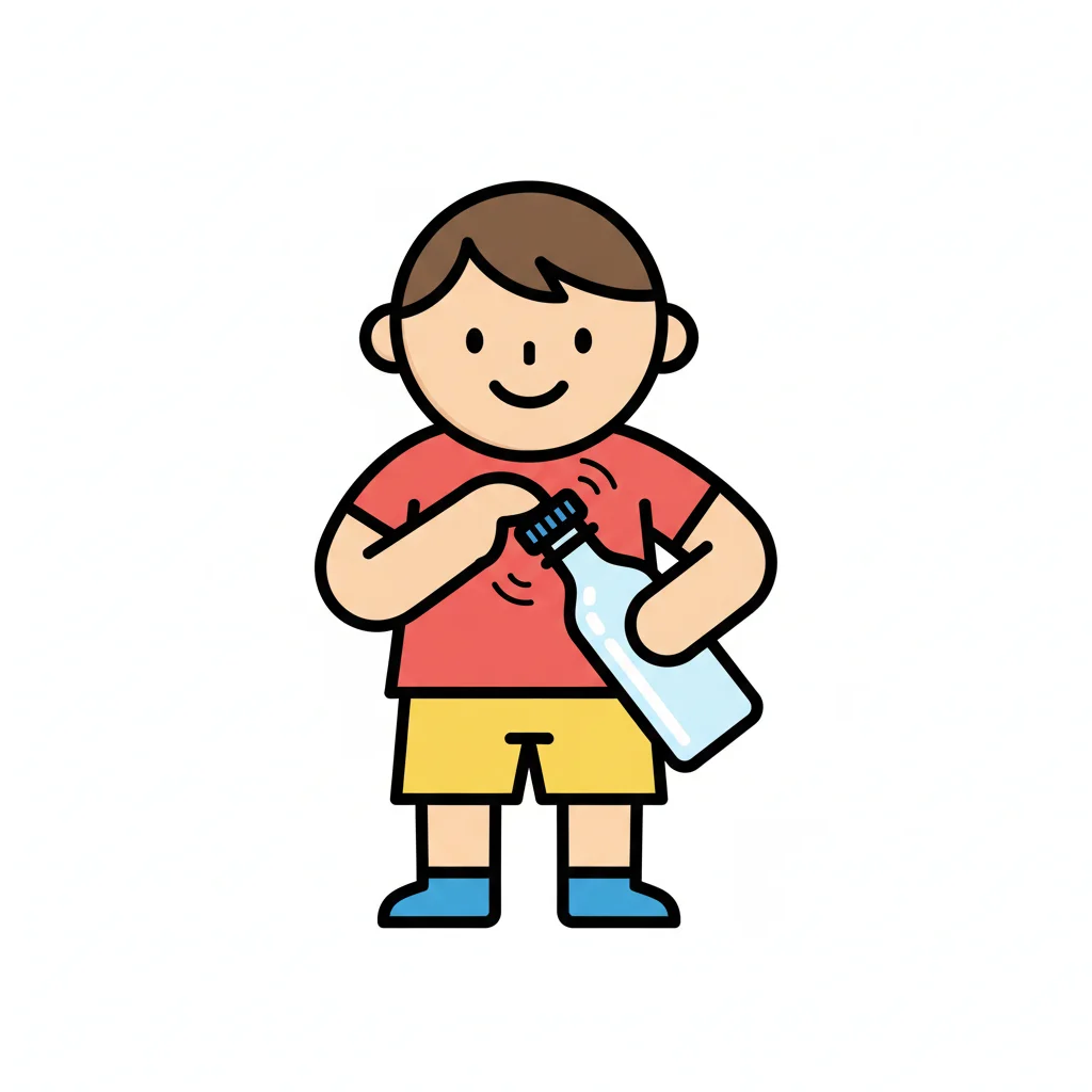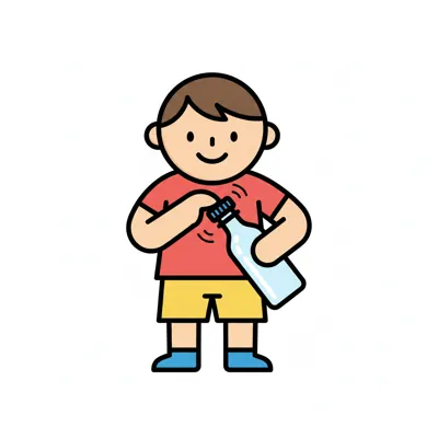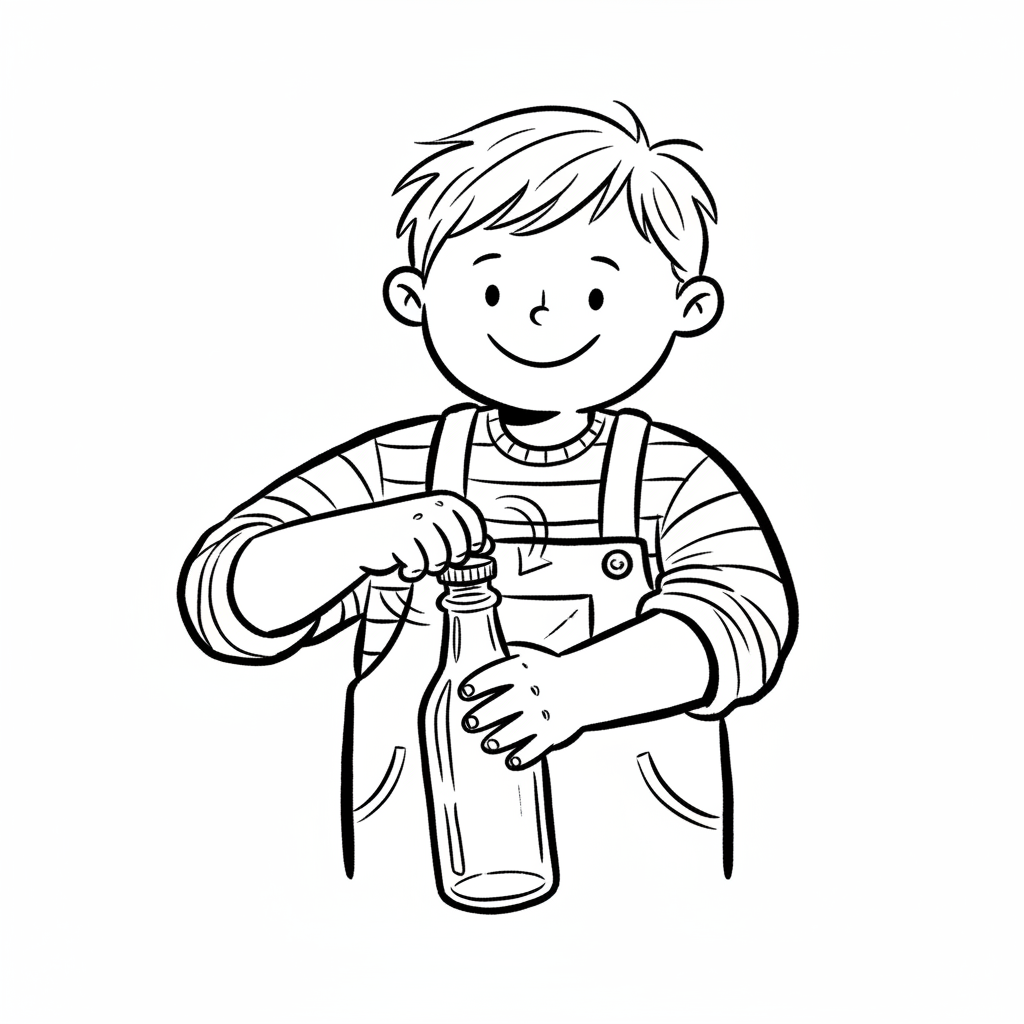 Ein Junge öffnet eine Flasche und lächelt dabei.