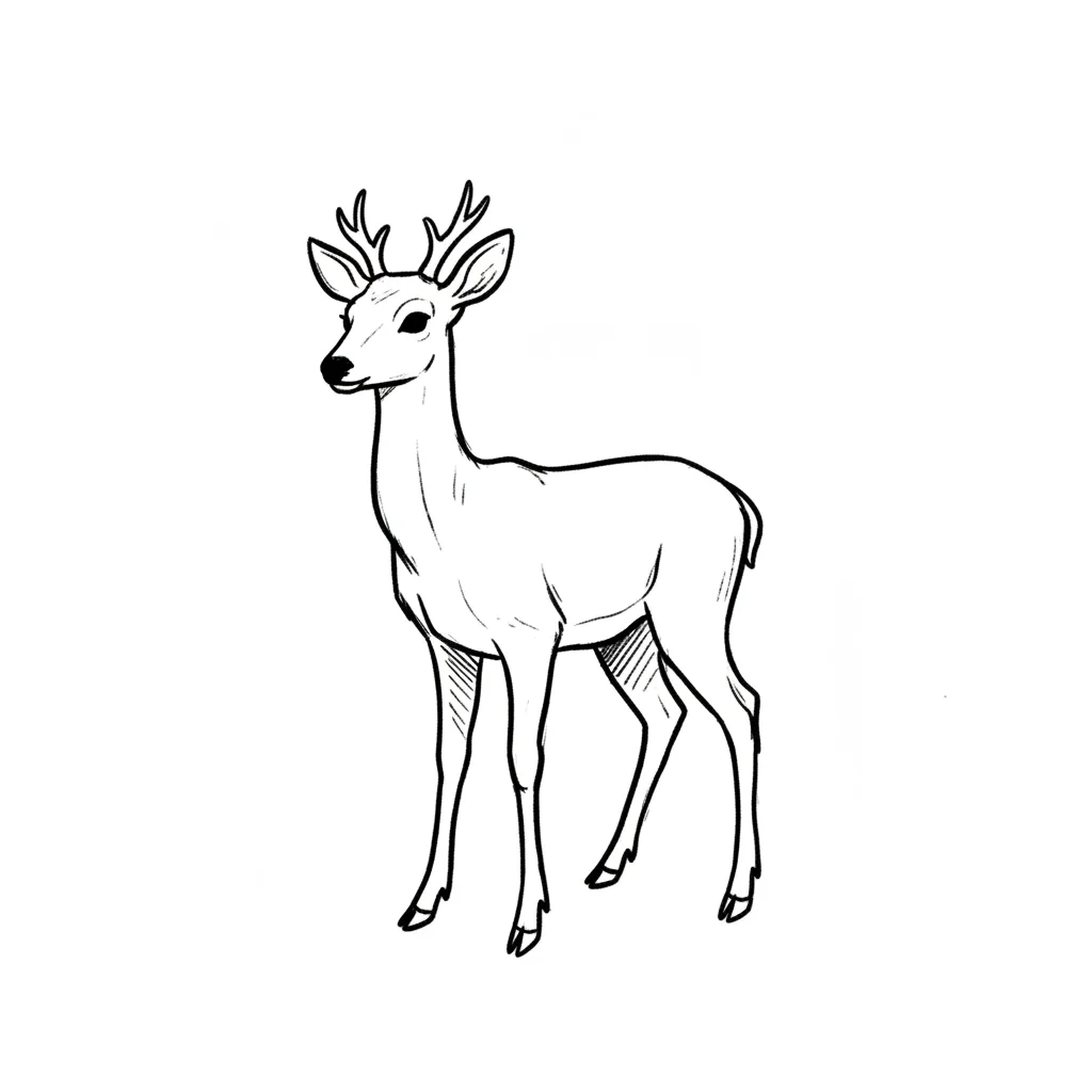 Ein skizziertes Reh steht aufrecht mit einem verträumten Blick.