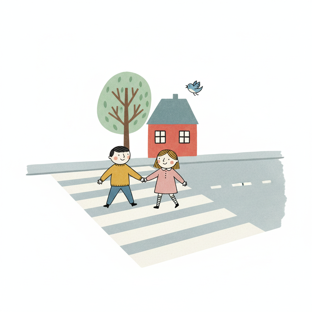 Zwei Kinder halten Händchen und überqueren einen Zebrastreifen vor einem Haus mit Baum.