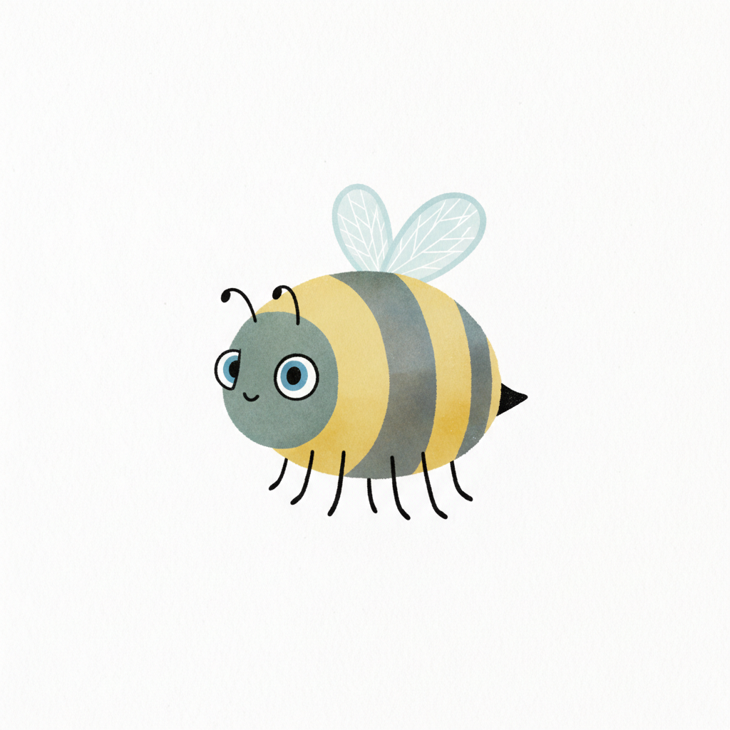 Niedliche Cartoon-Biene mit gelb-grauen Streifen, großen blauen Augen und kleinen Flügeln auf weißem Grund.