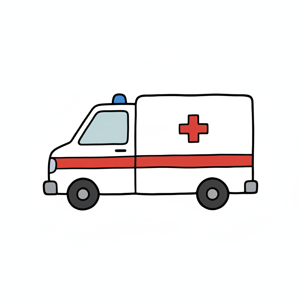 Einfache Zeichentrick-Ambulanz in Weiß mit rotem Streifen, blauem Blaulicht und rotem Kreuz.